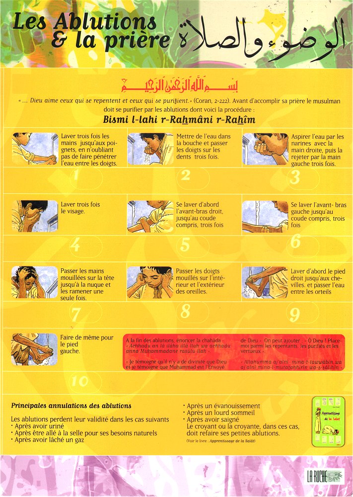 • Les ablutions : étapes illustrées, les principales annulations des ablutions.