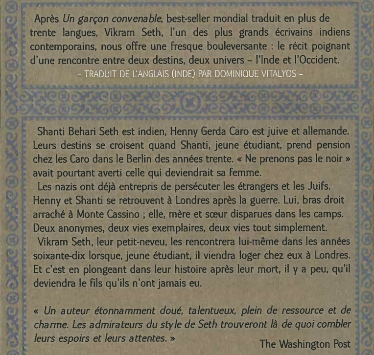 Après Un garçon convenable, best-seller mondial traduit en plus de trente langues, Vikram Seth, l'un des plus grands écrivains indiens contemporains, nous offre une fresque bouleversante : le récit poignant d'une rencontre entre deux destins, deux univers - l'Inde et l'Occident. Shanti Behari Seth est indien, Henny Gerda Caro est juive et allemande. Leurs destins se croisent quand Shanti, jeune étudiant, prend pension chez les Caro dans le Berlin des années trente. " Ne prenons pas le noir " avait pourtant averti celle qui deviendrait sa femme.