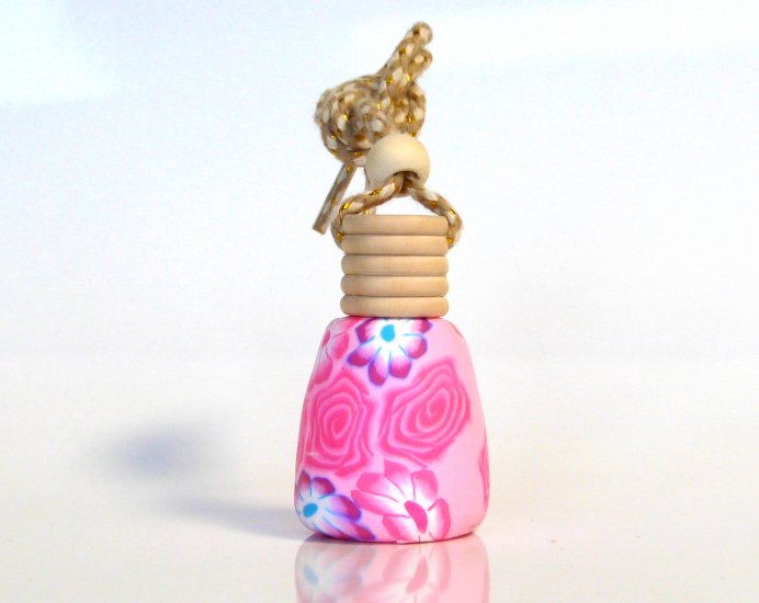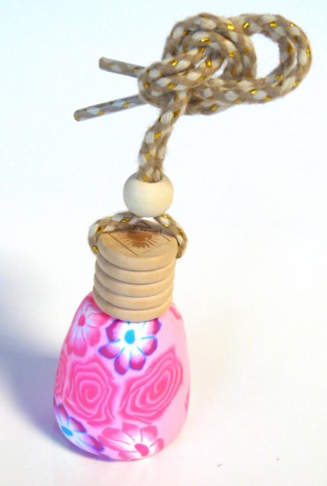 Joli flacon rose en verre avec bouchon bois pour diffuser le parfum de façon harmonieuse, à suspendre dans la voiture (au rétroviseur par exemple). Peut être utilisé également dans une armoire ou tout autre endroit à parfumer.