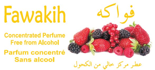 Parfum concentré sans alcool Musc d'Or "Fawakih" - Parfum mixte (femmes et hommes). Le mot arabe fawâkih (فواكه) signifie fruits.