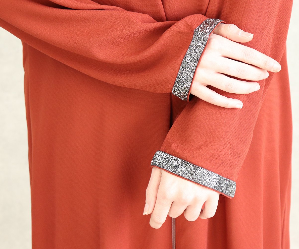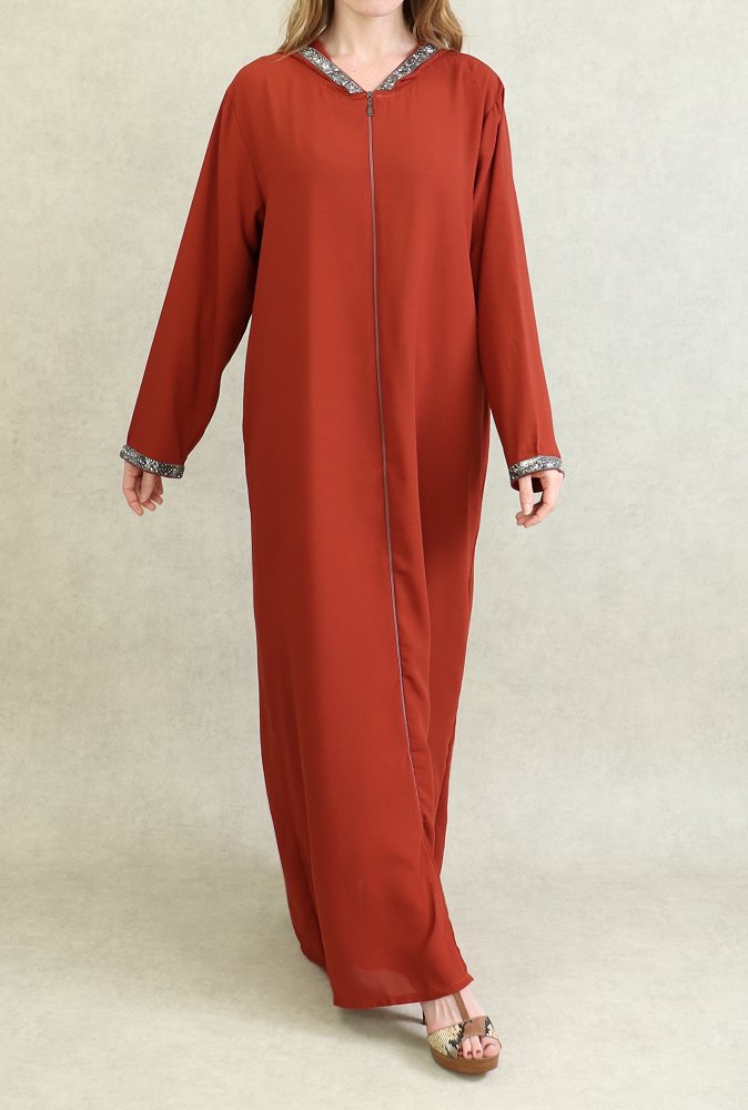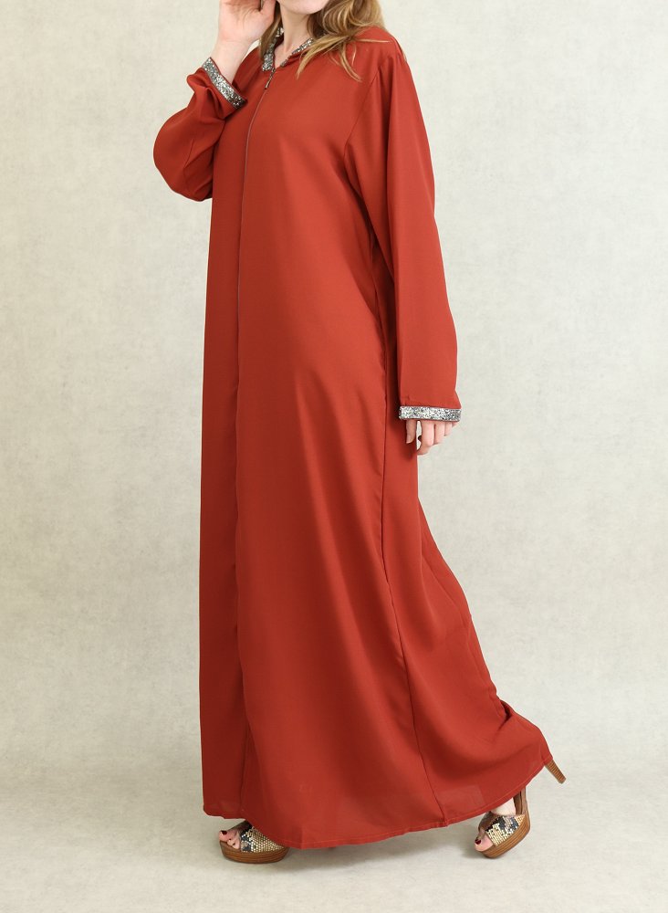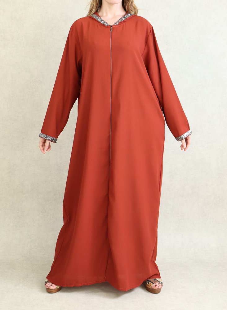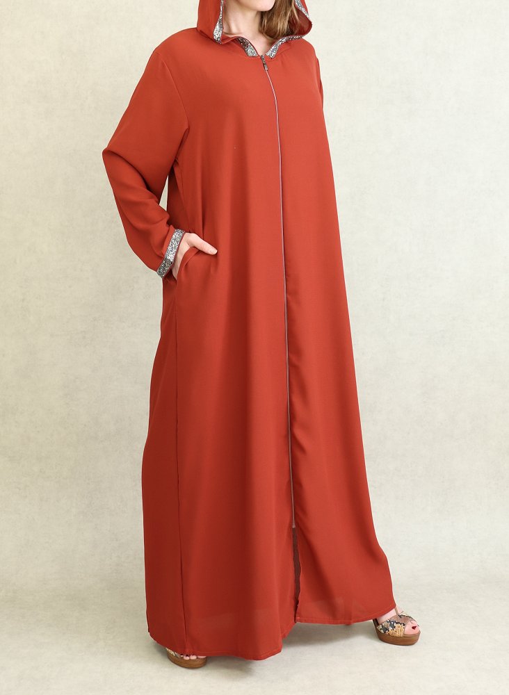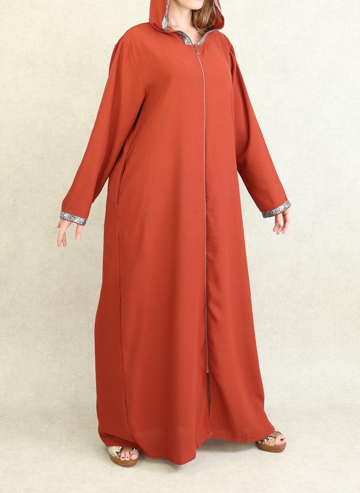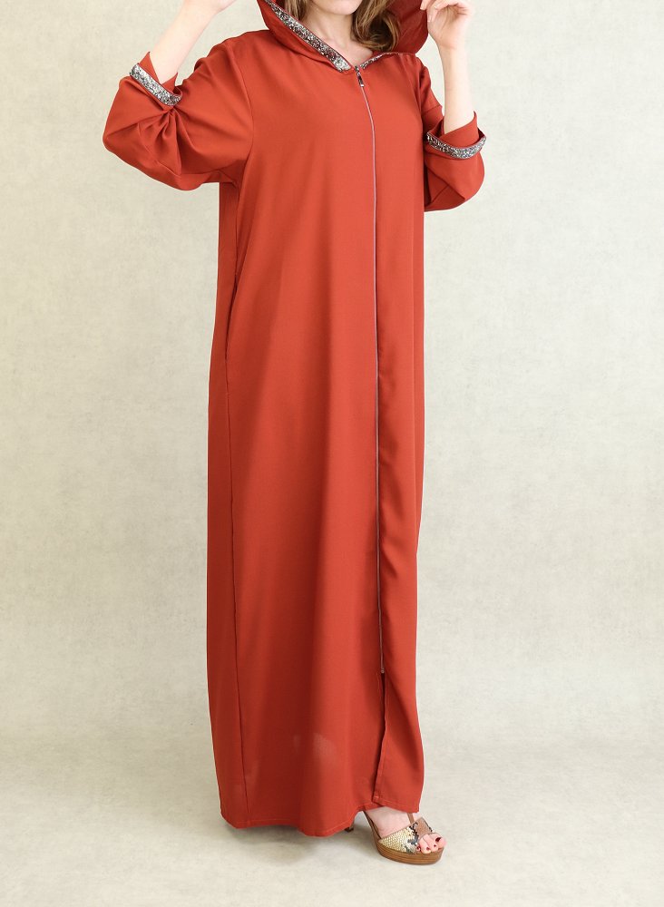 Djellaba à capuche Avec fermeture éclair. Jolis strass sur les poignets ainsi que le contour de la capuche. Deux poches latérales pratiques pour ranger vos effets personnels.