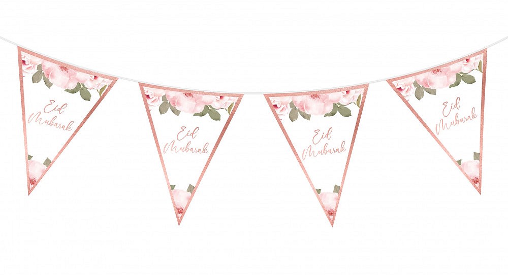 Drapeaux fleuris "Eid Mubarak" 16 fanions - 5 mètres de long - Guirlande Spécial fête de l'Aïd - Couleur rose doré - REF. 35143 (4.90 €) - En Promotion à 3.40 €