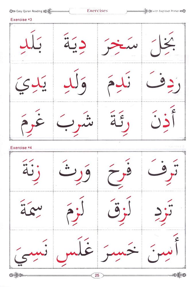 The subject of these books are from the original Baghdadi Qaeda book. They use a gradual system in teaching the alphabet and reading (for Children and beginning adults) from using the letters, to forming the word, to forming an Arabic sentence. And this is in an organized curriculum that similarly follows what has been used in Egyptian “Hifz Schools”. These books are teaching the reader the difference between Arabic script and Uthmani (Quran) script, provide them with exercises on each lesson with words examples directly from the Quran. Lesson on long vowels in Uthmani script, sound rules with exercises on Laam Qamariyyah and Laam Shamsiyyah and special exercises covered in these books, to practice the rules of reciting the Qur’an.