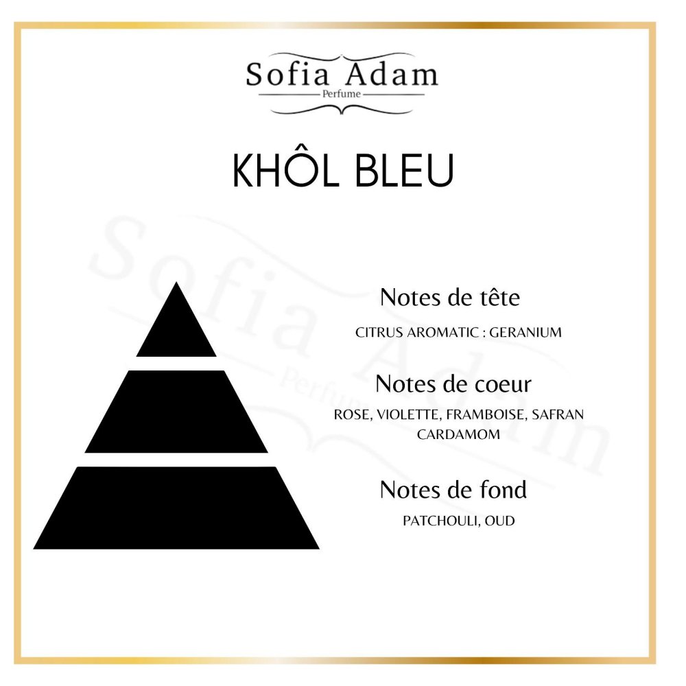L'eau de parfum KHÔL BLEU esquisse le corps à corps séducteur d'une note de bois d'oud et d'une rose damascena charnue et sensuelle. Voluptueuse, construite avec une audace qui ne souffre d'aucun compromis, la silhouette boisée et florale de cette eau de parfum mixte dessine un sillage opulent et puissant.