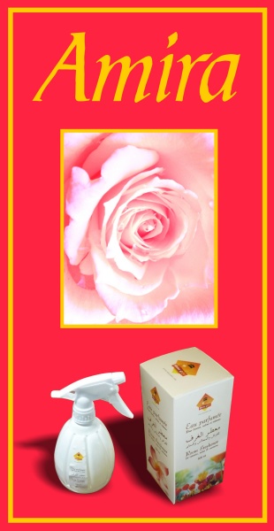 Eau parfumée désodorisante Musc d'Or "Amira" pour literies, salons, rideaux, vêtements, sièges de voitures, etc. Fini les mauvaises odeurs. Bien agiter avant utilisation.