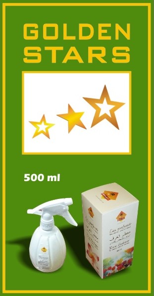 Eau parfumée désodorisante Musc d'Or "Golden Stars" - Pour literies, salons, rideaux, vêtements, sièges de voitures, etc. Fini les mauvaises odeurs. Bien agiter avant utilisation.