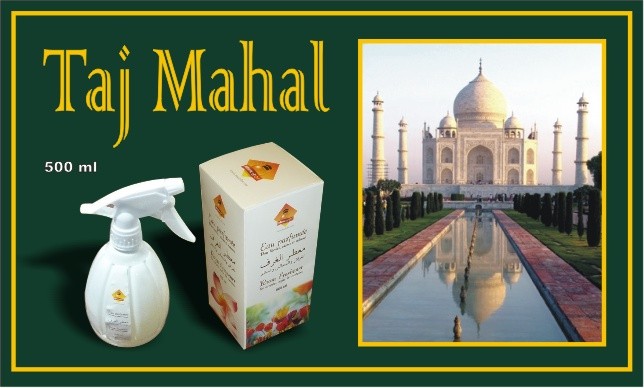 Eau parfumée désodorisante Musc d'Or "Taj Mahal" - Pour literies, salons, rideaux, vêtements, sièges de voitures, etc. Fini les mauvaises odeurs. Bien agiter avant utilisation.