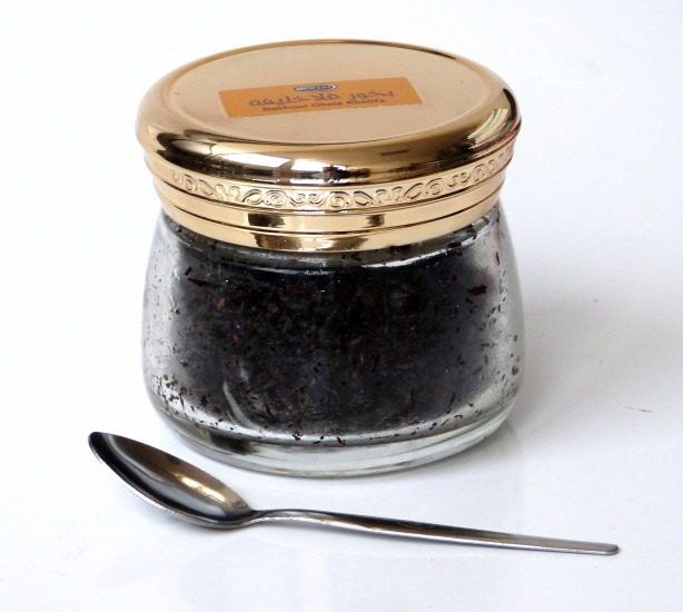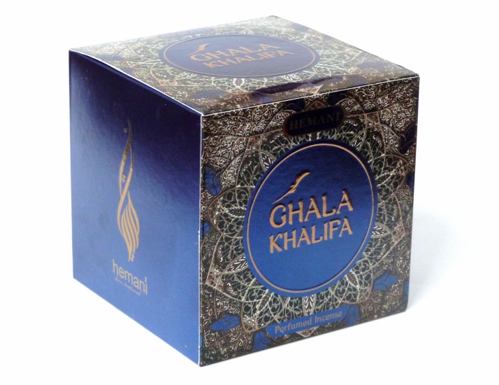 Bakhour (encens) "Ghala Khalifa" pour parfumer son intérieur aux senteurs orientales, présenté dans un emballage joliment décoré et fourni avec une cuillère de dosage.