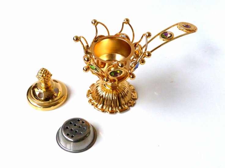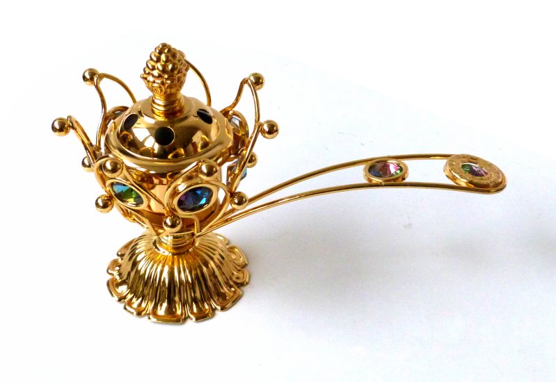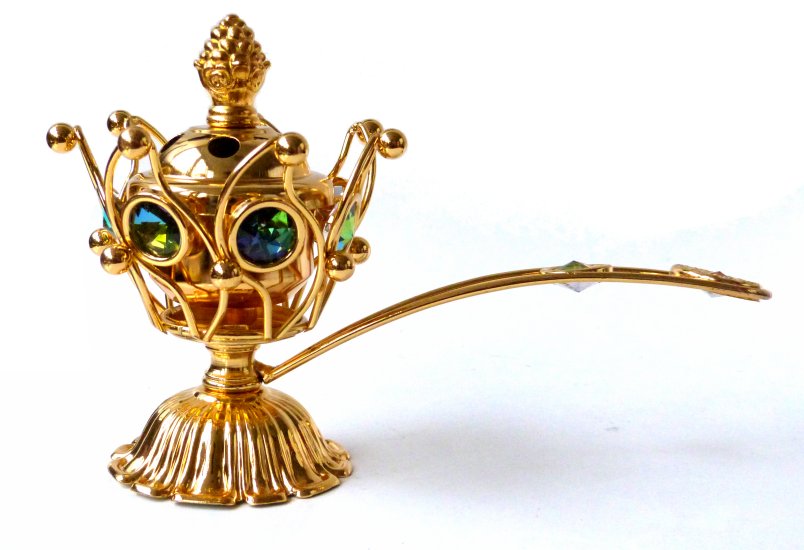 Bel objet décoratif avec gros diamants... Cet encensoir métallique doré possède une poignée pour le transporter aisément pendant qu'il est allumé.