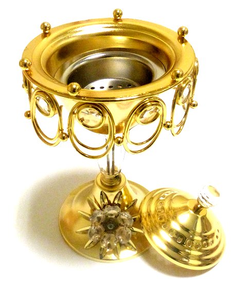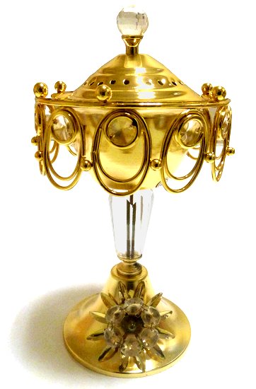 Bel encensoir métallique doré décoré avec des "diamants" blancs, le couvercle du haut est assortie un gros "diamant" rond.