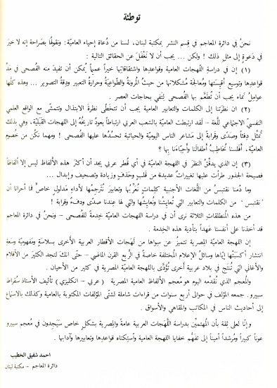 نحن في دائرة المعاجم في قسم النشر بمكتبة لبنان ناشرون، لسنا من دعاة إحياء العامية: ونقولها بصراحة إنه لا خير في دعوة إلى مثل ذلك! ولكن... يجب أن لا نغفل عن الحقائق إن في دراسة اللهجات العامية وقواعدها واشتقاقاتها خيراً عميماً يمكن أن تفيد