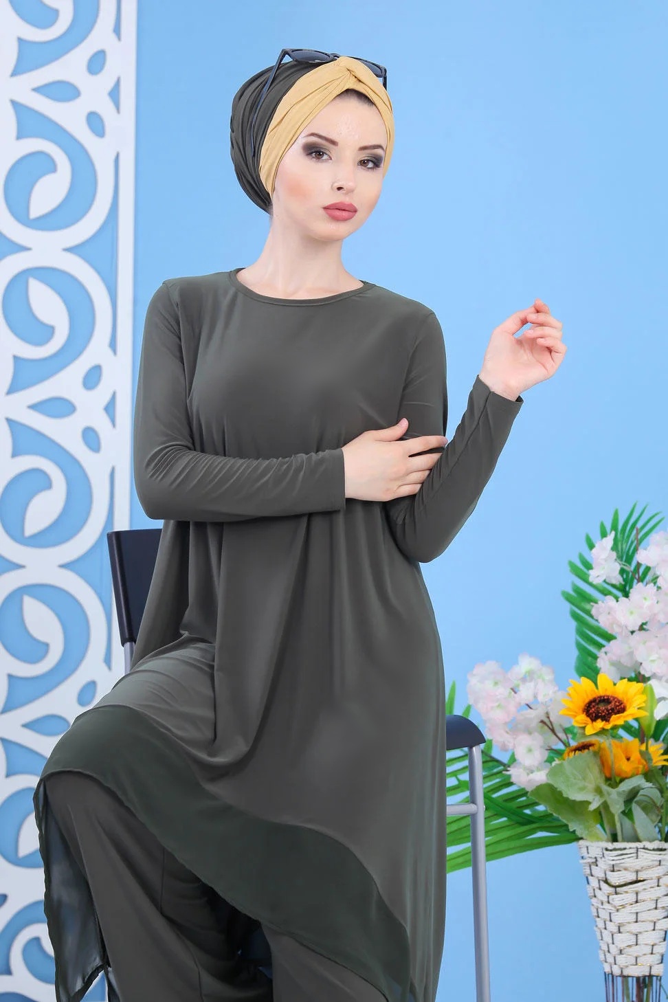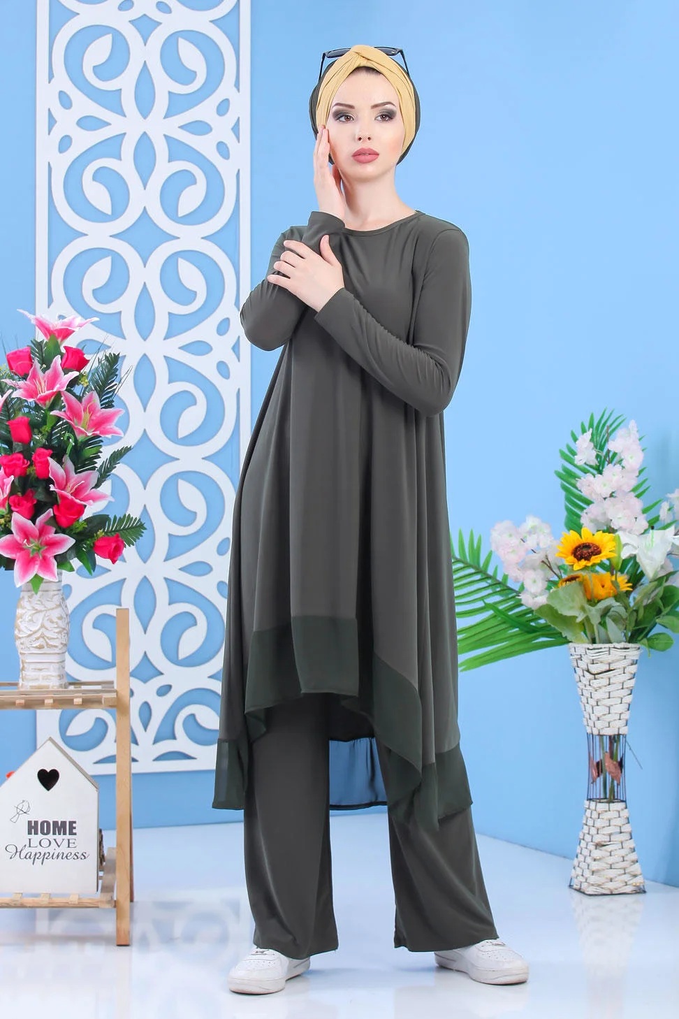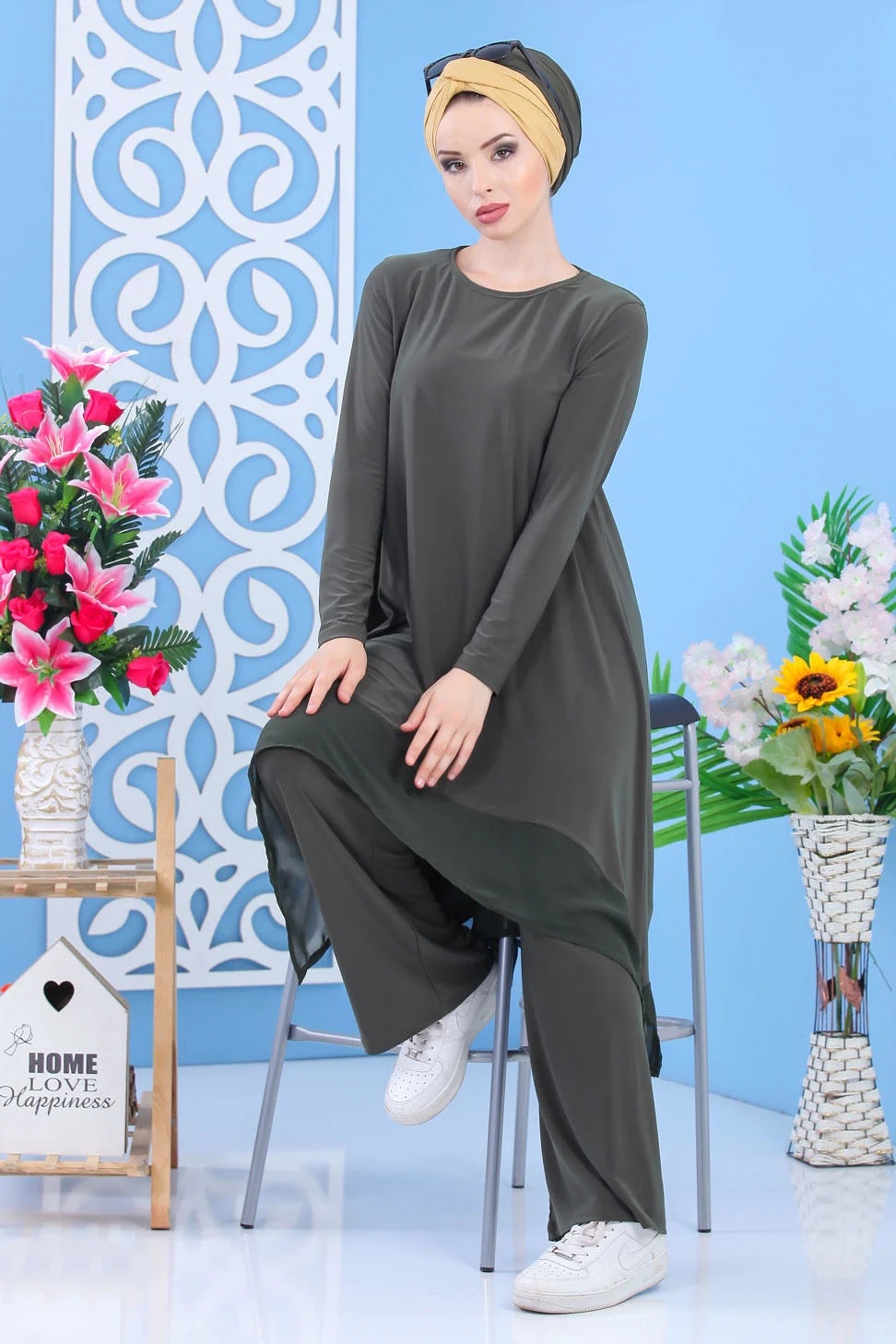 Ensemble tunique à boutons et pantalon assorti pour femme (Vetement mastour pour hijab) - Couleur kaki - REF. 36014 (36.90 €)