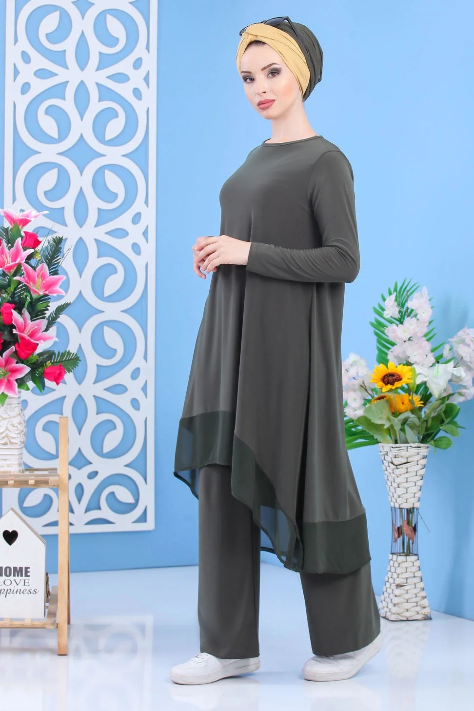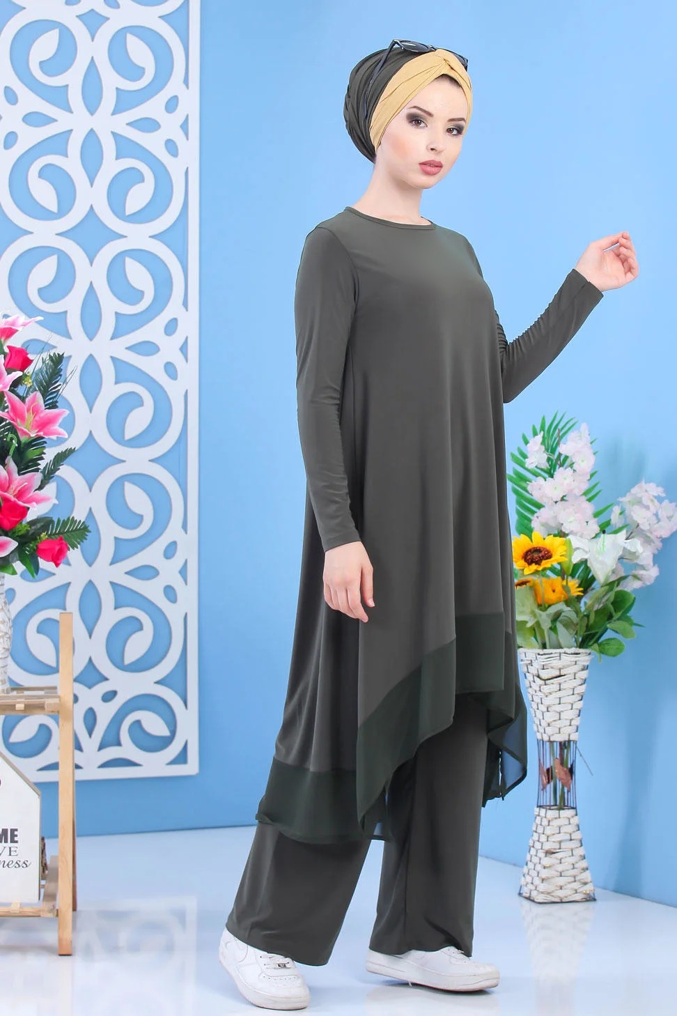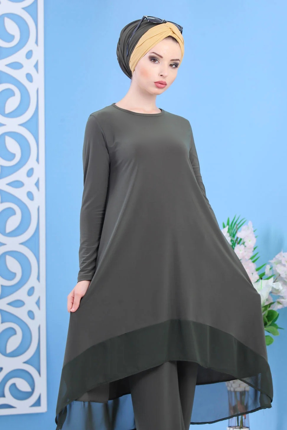 Ensemble tunique à boutons et pantalon assorti pour femme (Vetement mastour pour hijab) - Couleur kaki - REF. 36014 (36.90 €)