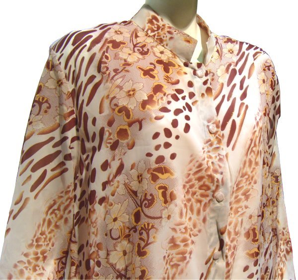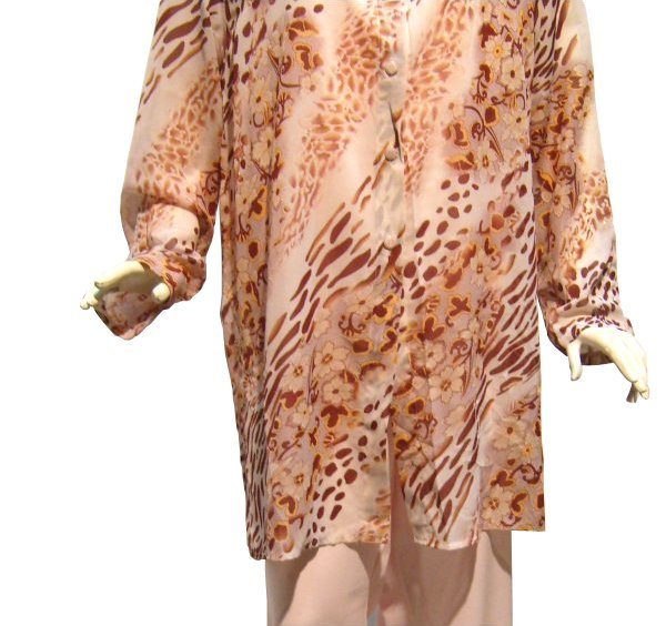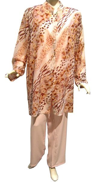 Ensemble élégant constitué d'un chemisier blanc avec motifs marrons, d'un sous-chemisier et d'un pantalon tous deux blancs.