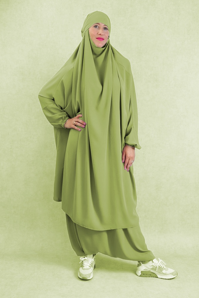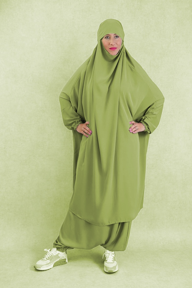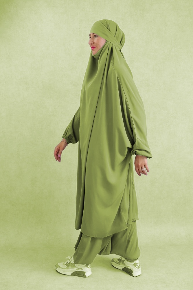 Ensemble Jilbab femme deux (2) pièces cape et sarouel (pantalon) - Couleur Vert Kaki Clair Vetement & Accessoire Coup de coeur