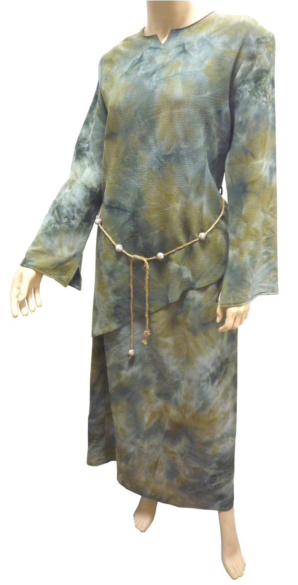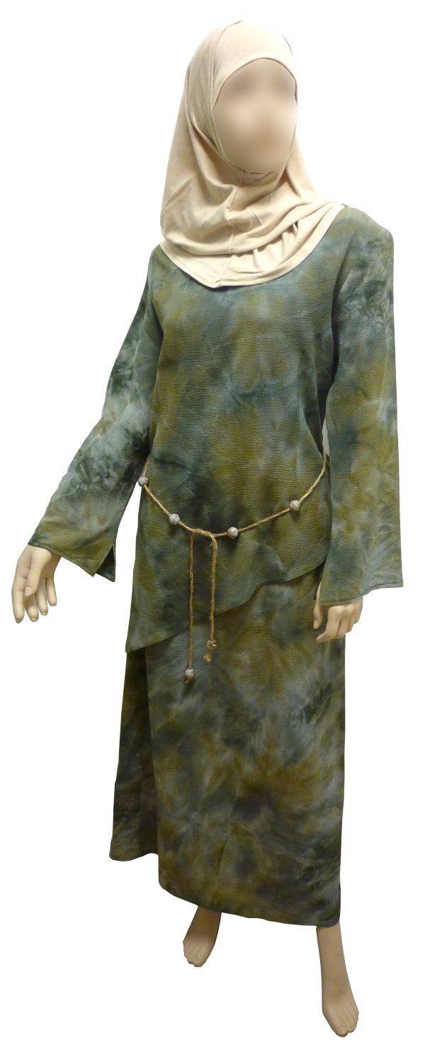 Ensemble aux couleurs mélangées (bleu, marron, gris...) composé d'une tunique avec ceinture originale et de sa jupe assortie (fermeture zip à l'arrière). Le hijab sur la photo n'est pas fourni.