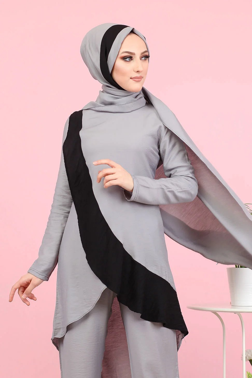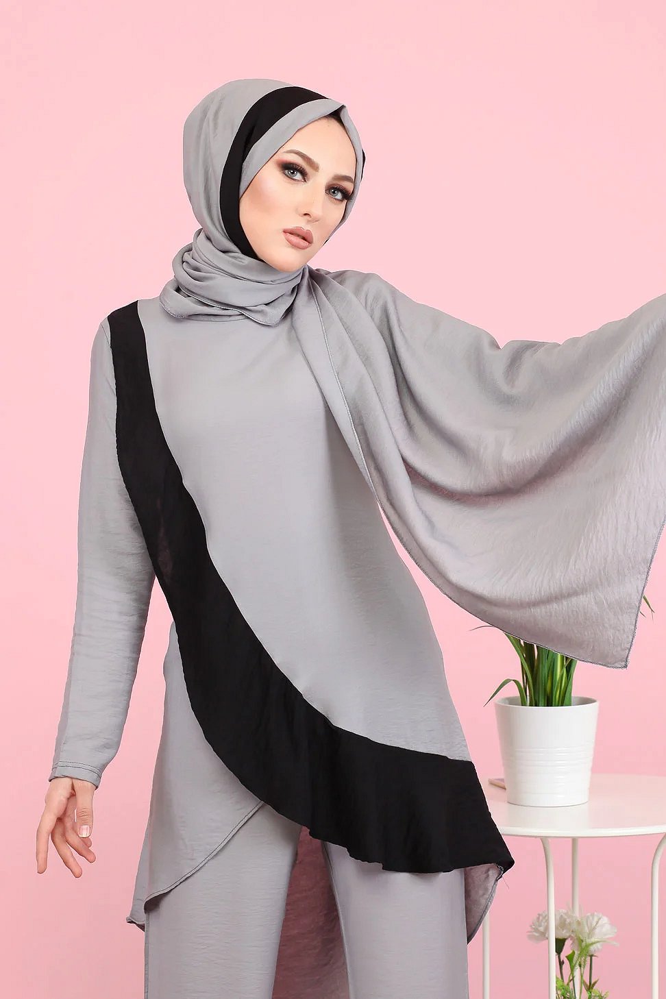 Ensemble ample 3 pièces : tunique - pantalon et voile assorti (Vetement pour femme voilée) - Couleur Gris Vetement & Accessoire