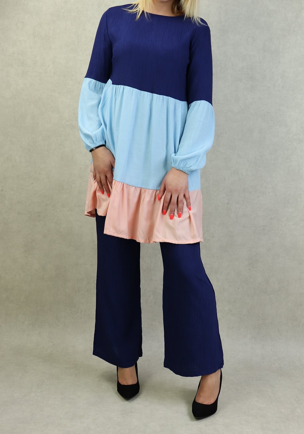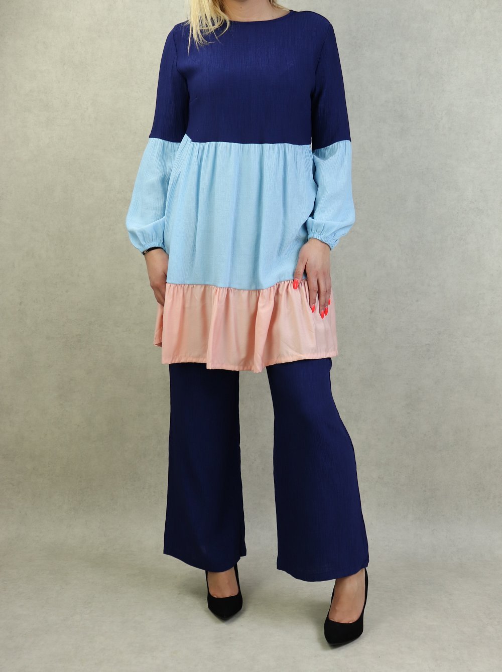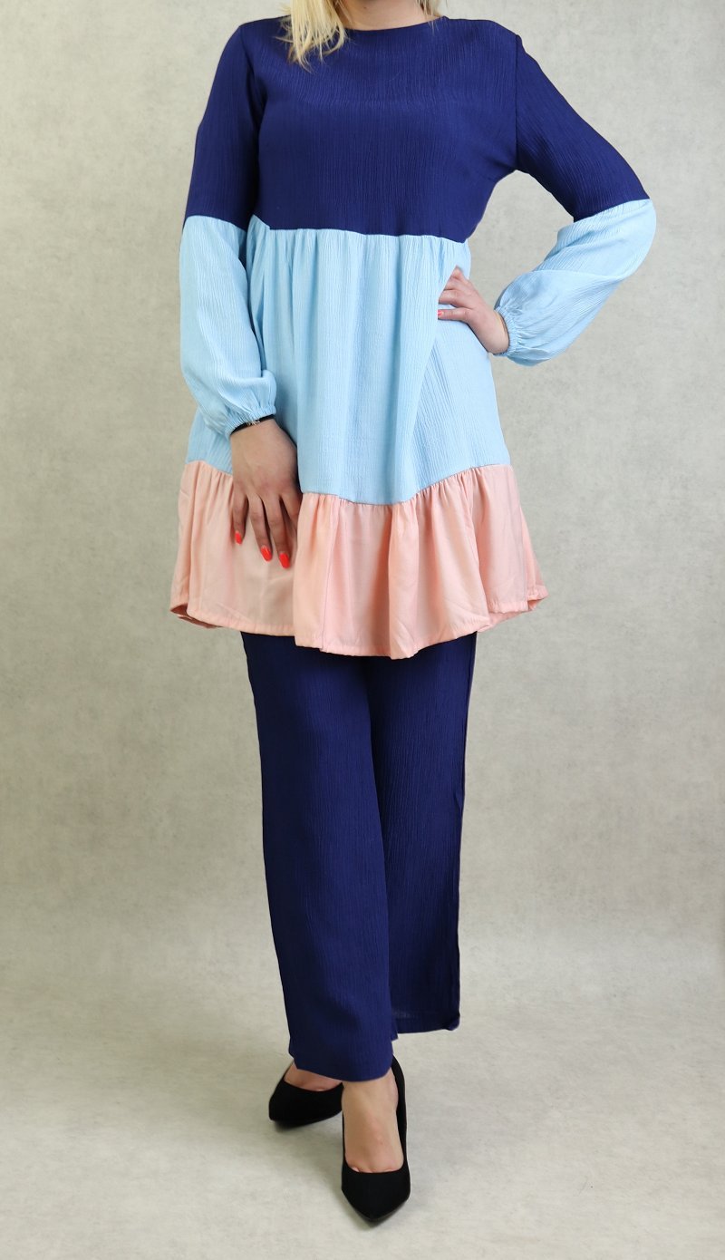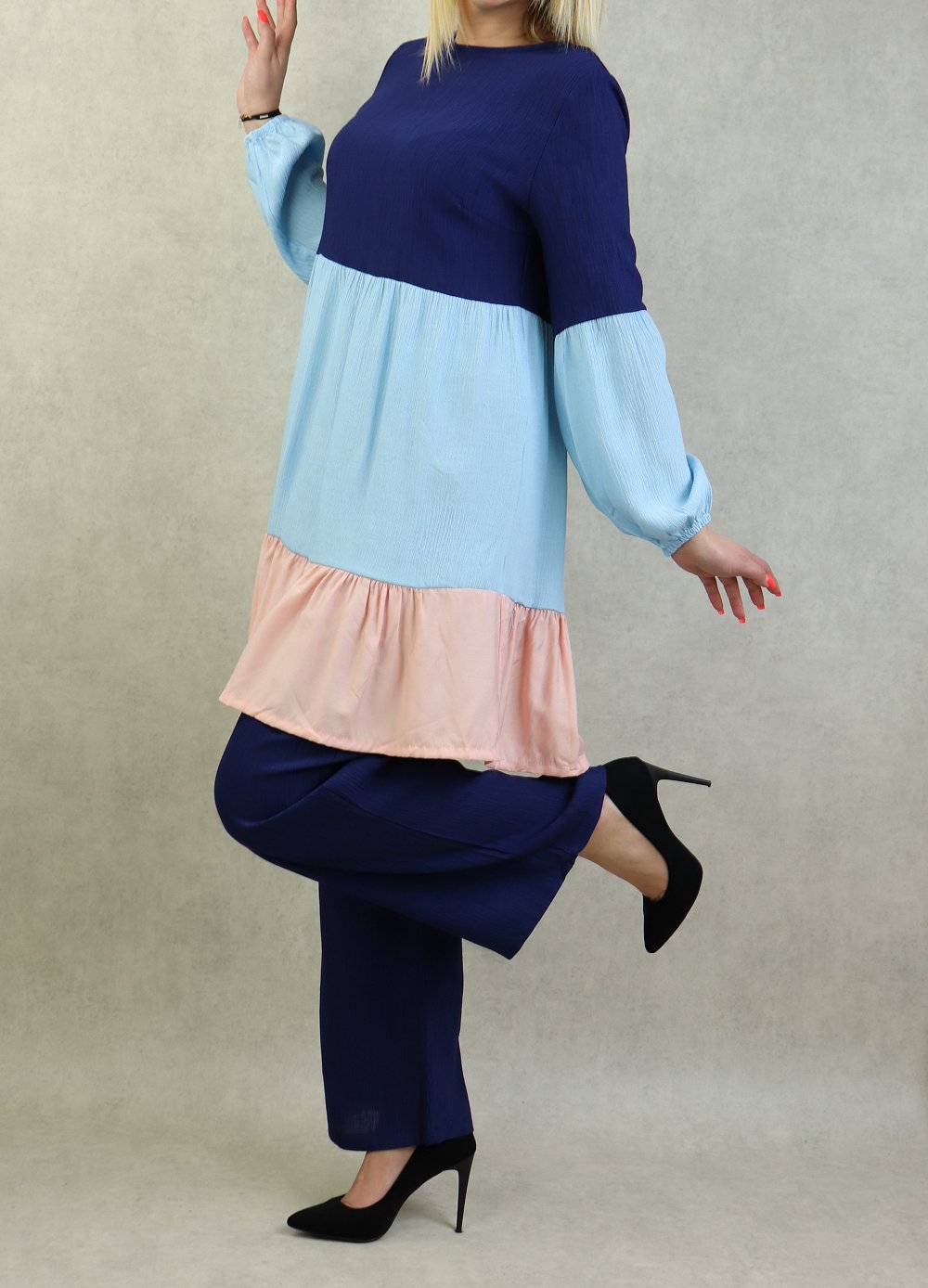 Ensemble ample et decontracte 2 pieces (tunique et pantalon) de couleur bleu marine, bleu ciel et saumon (Grande taille pour femme)