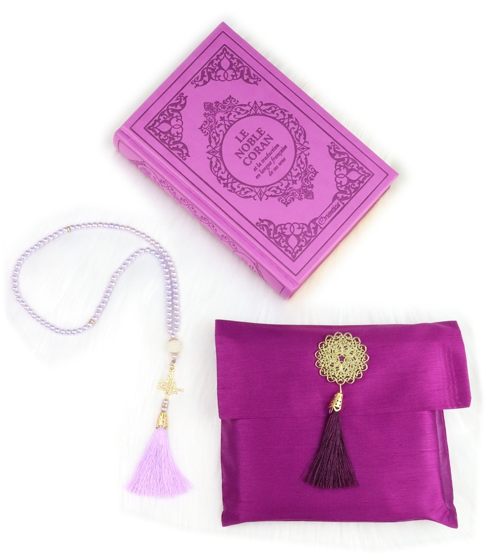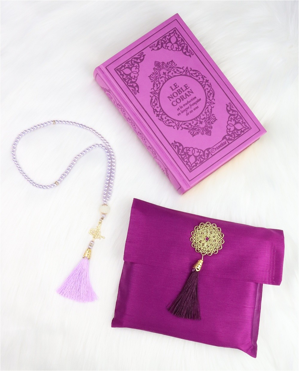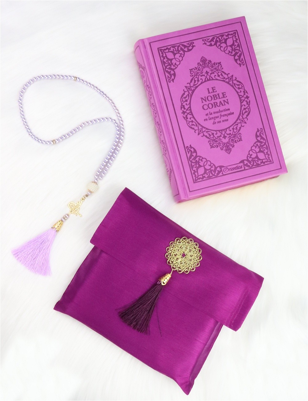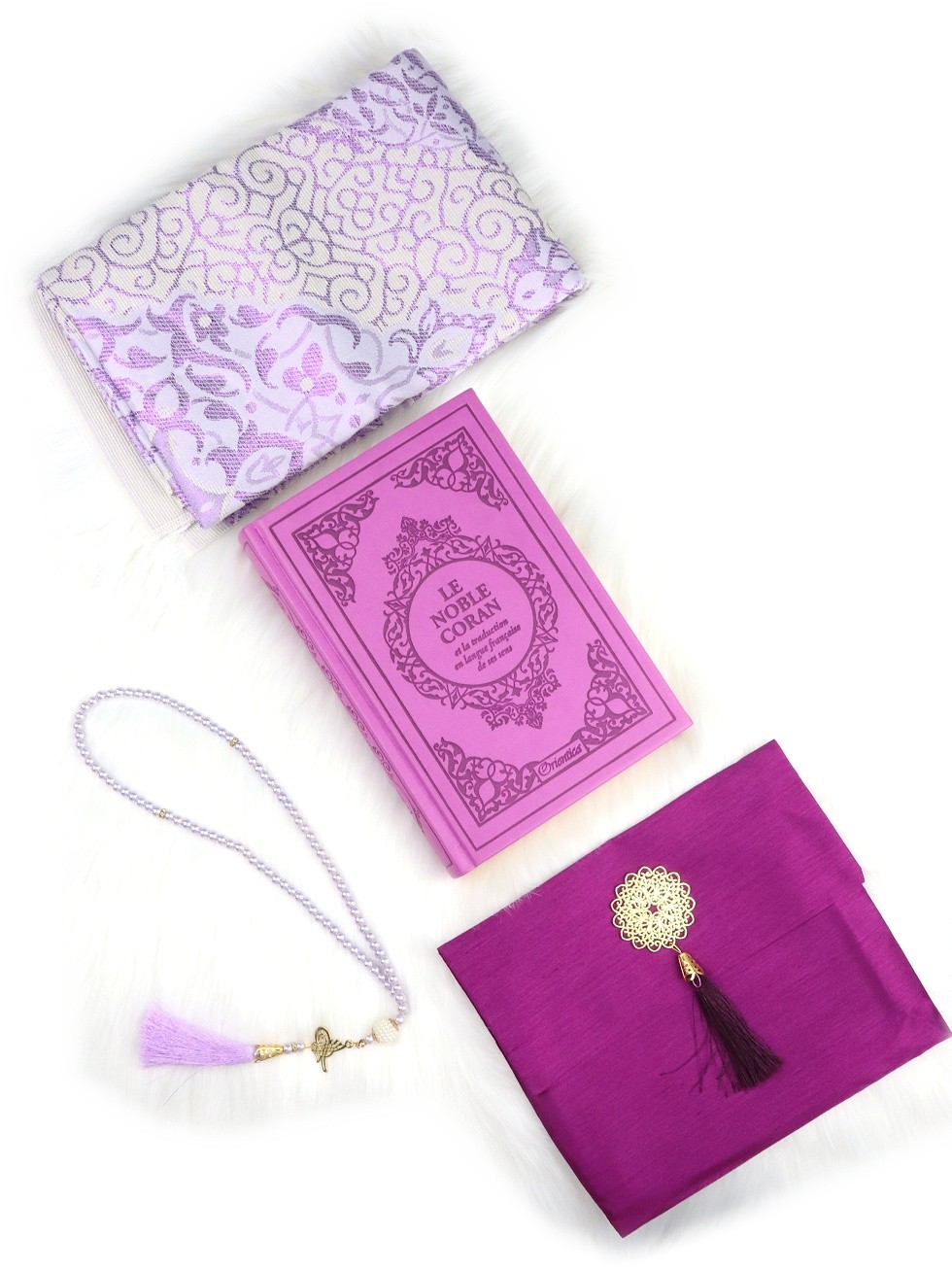 Ensemble cadeau pour femme musulmane : Pochette contenant un Tapis de priere et une Sebha de luxe + Le Noble Coran bilingue (francais/arabe) - Couleur Mauve-Violet