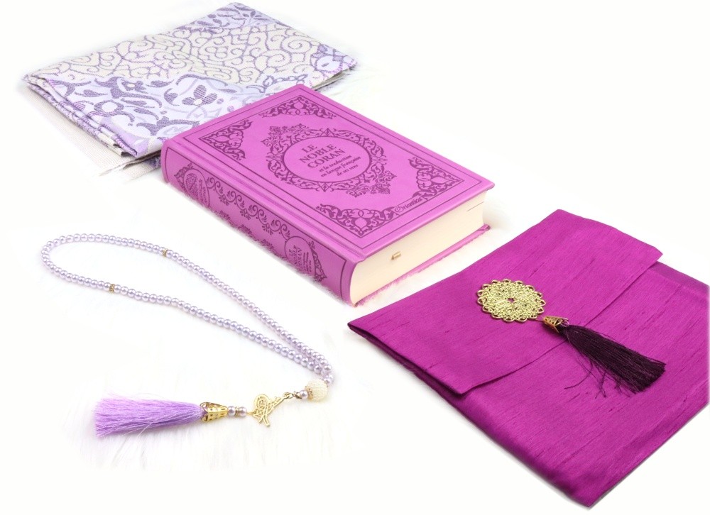 Pack cadeau mauve : Le Noble Coran (bilingue français/arabe) + La Citadelle du Musulman + Porte Coran + Tapis de prière en velours + Parfum Musc d'Or Luxe (au choix) - REF. 23308 (39.90 €)