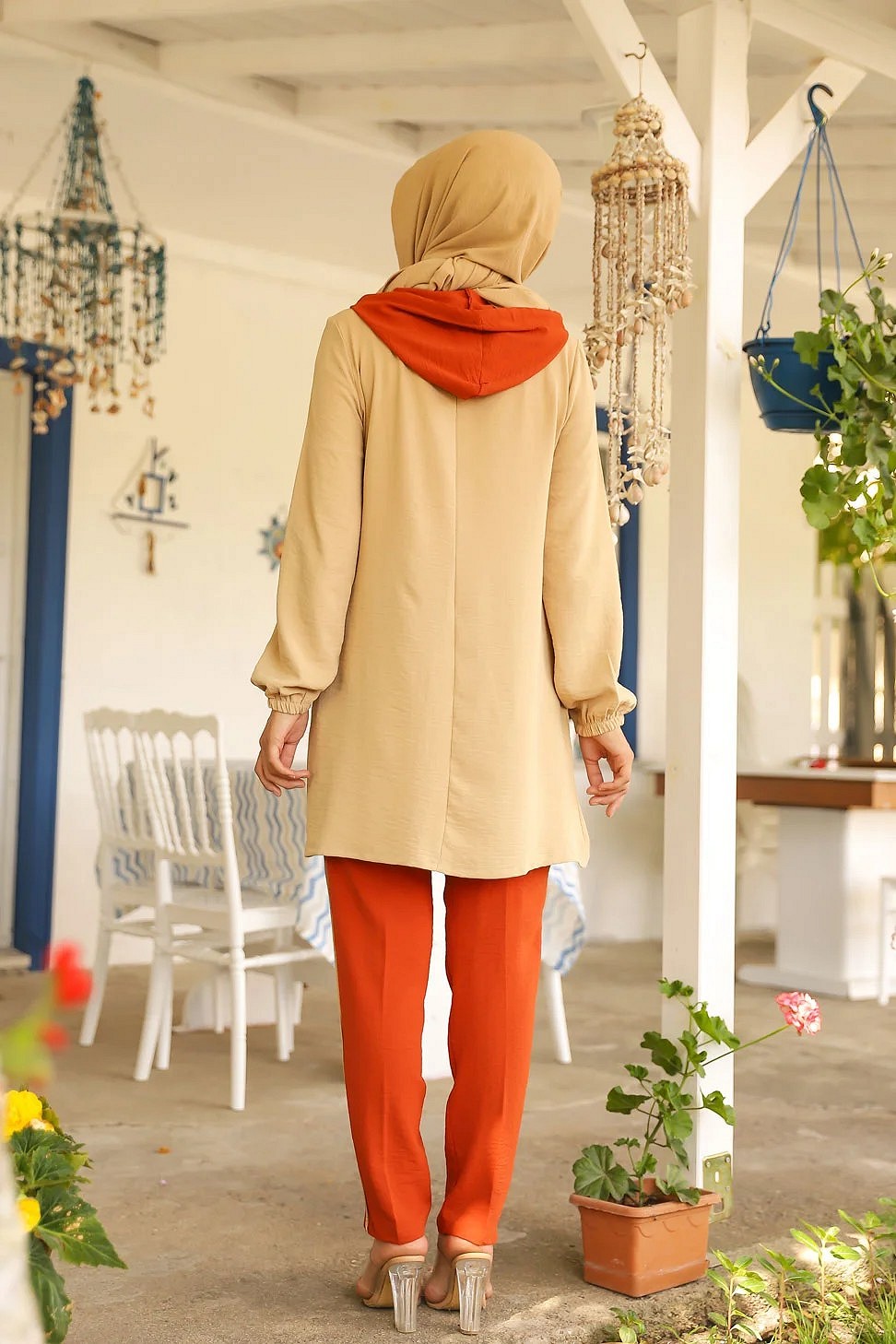 Ensemble casual tunique a capuche et pantalon (Modest Fashion) - Couleur beige et brique