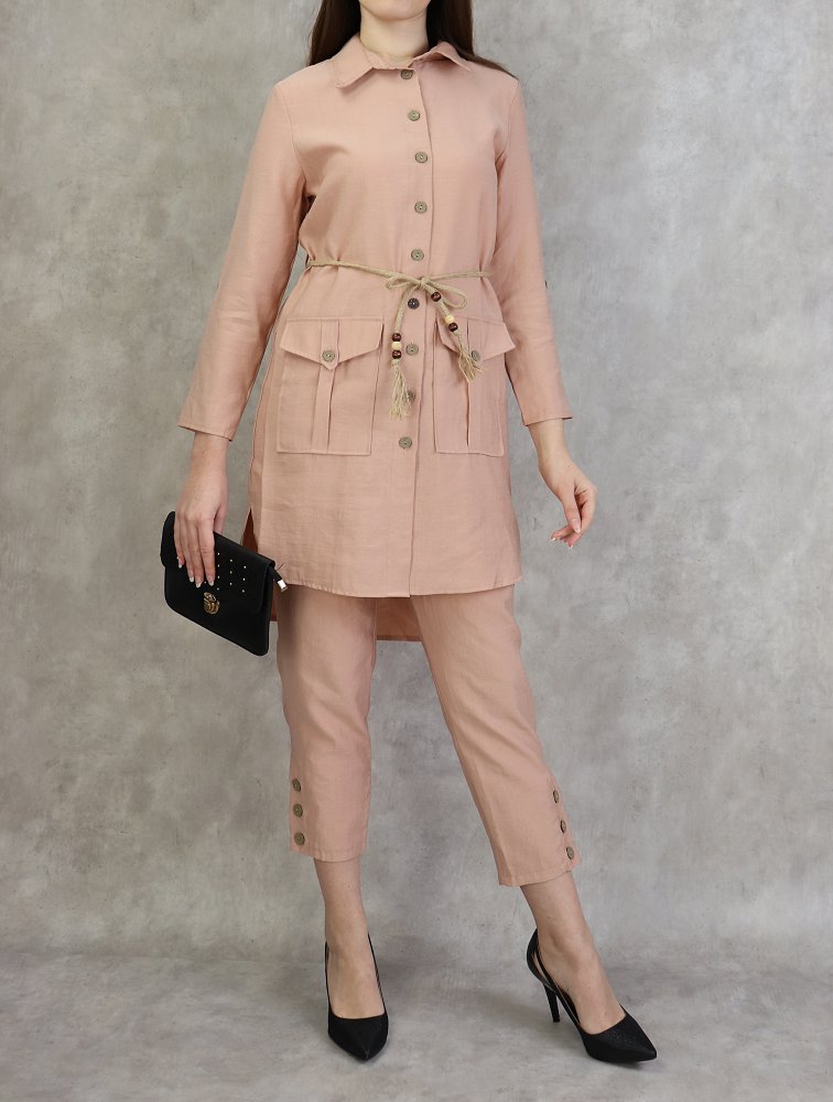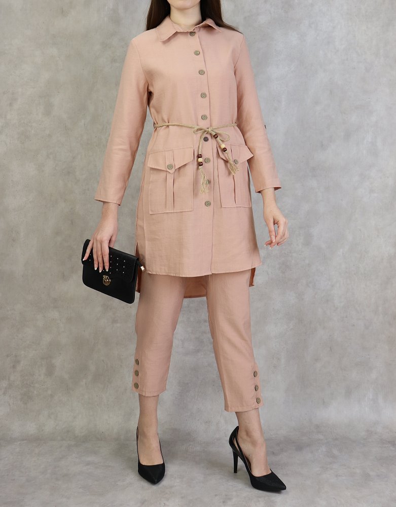 Ensemble 2 pièces. Veste : mi longue, col chemise, fermeture boutons, manches ajustables, ceinture tressée ornée de perles en bois, 2 poches plaquées à rabats. Pantalon : coupe droite, fermeture à glissière, boutons sur le bas. Tissu léger et opaque, effet tissé.