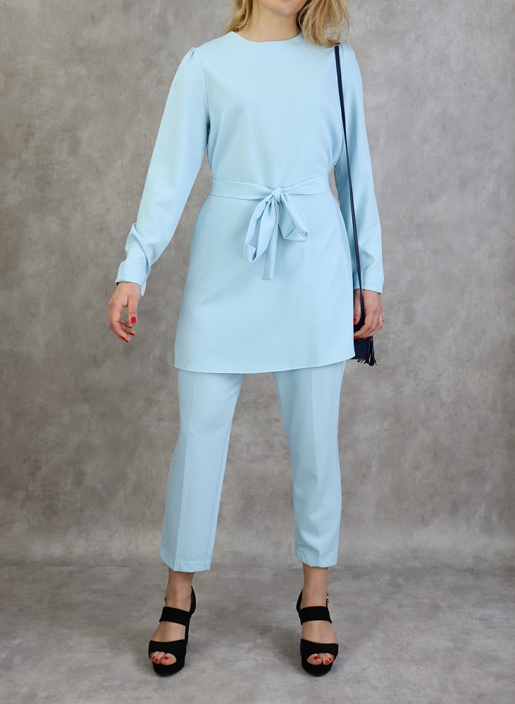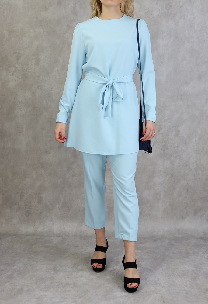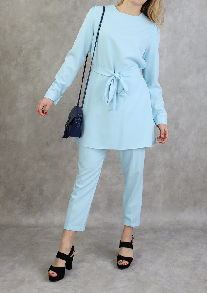 Ensemble 2 pièces. Tunique mi longue, col rond, fermeture bouton, manches finition bouton aux poignets, ceinture assortie, coupe evasée. Pantalon, taille élastique, 2 poches italiennes, coupe classique. Tissu doux, fluide et non transparent.