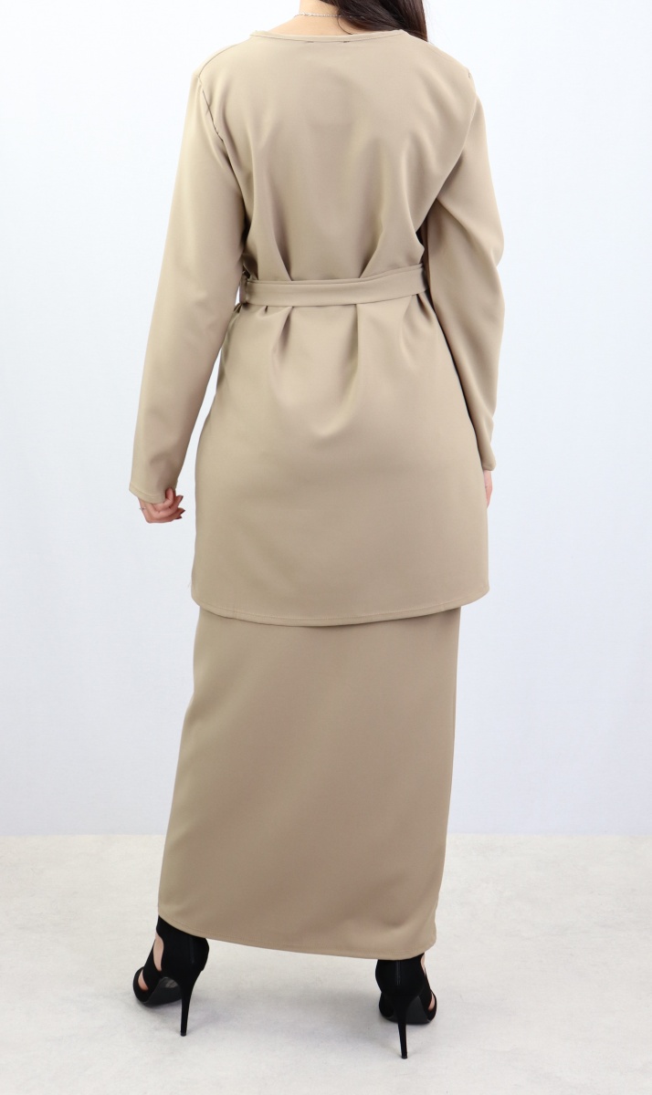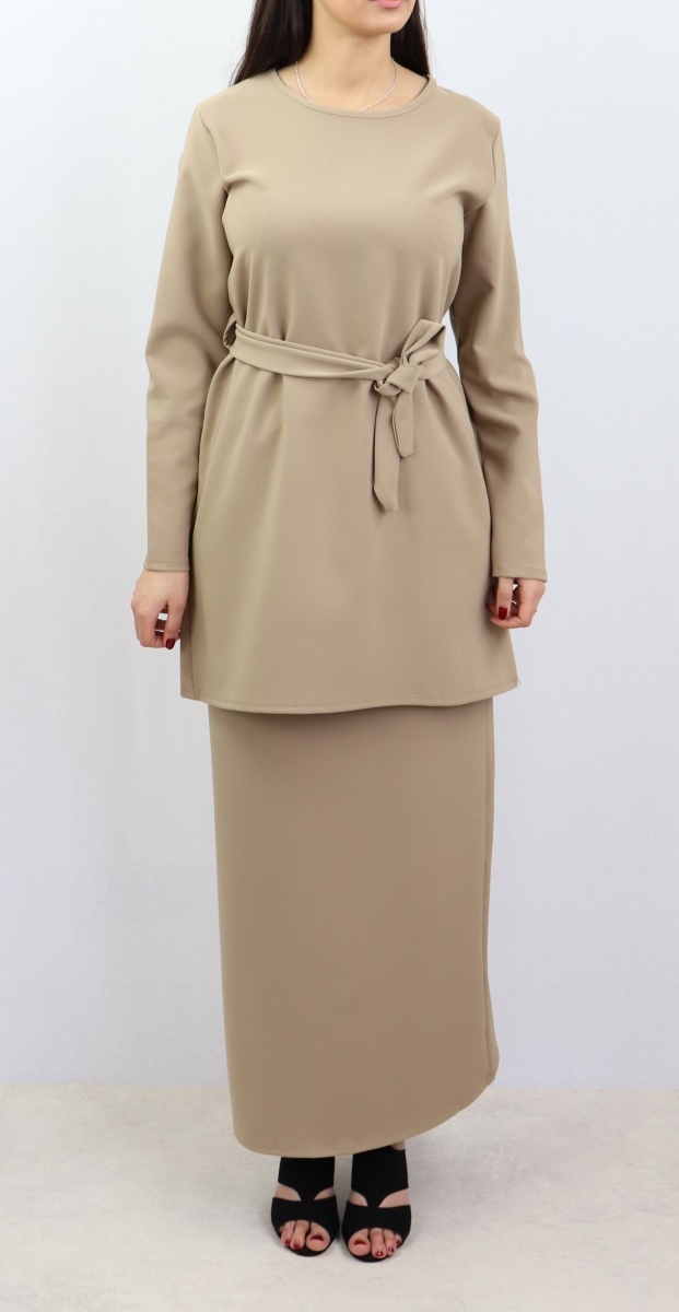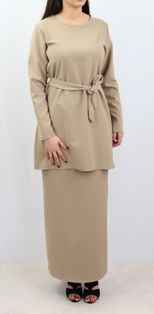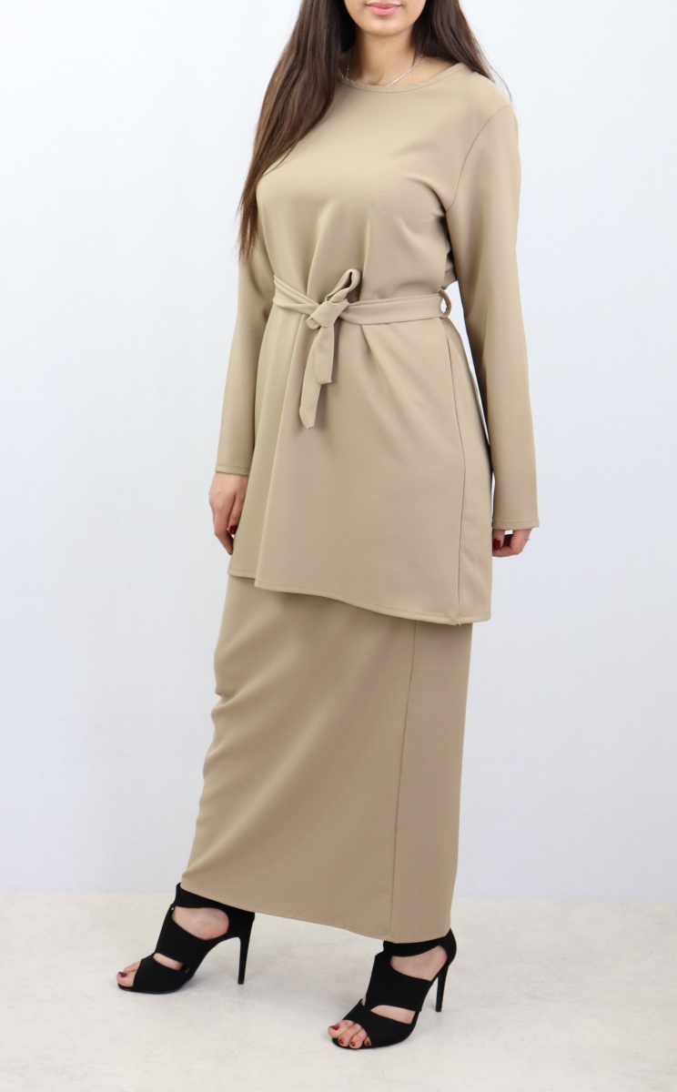 Très bel ensemble sobre et élégant constitué d'une jupe droite casual qui s'adapte à tous les styles. Longueur 100 cm, taille élastique. Longueur de la tunique 83 cm avec sa ceinture assortie. Peut être porté avec tous types de chaussures (tennis, bottines, escarpins...)