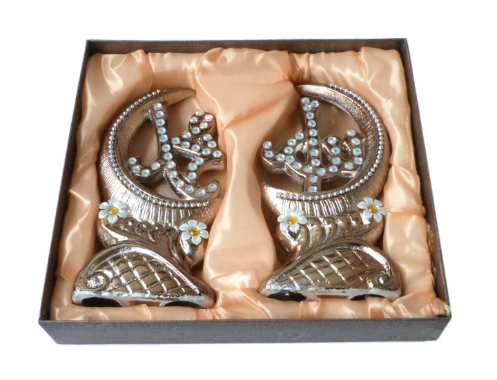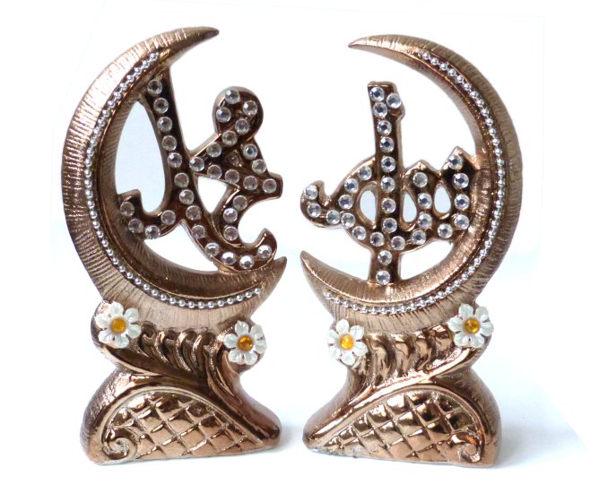 Ensemble de 2 pièces décoratives bronze avec inscription Allah et Mohammed décorées de diamants - REF. 23521 (19.90 €)