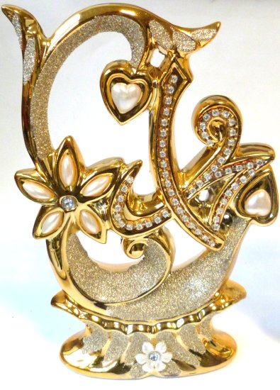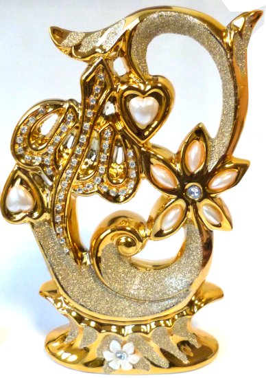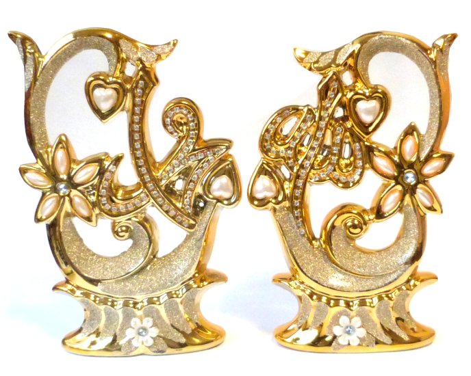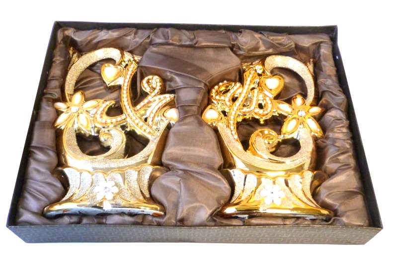 Très bel ensemble en porcelaine constitué de deux pièces décoratives dorées avec inscription Allah et Mohammed, décorées de rubis et de diamants blancs. Fourni dans une boite cadeau.