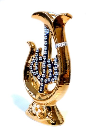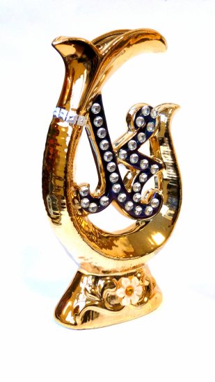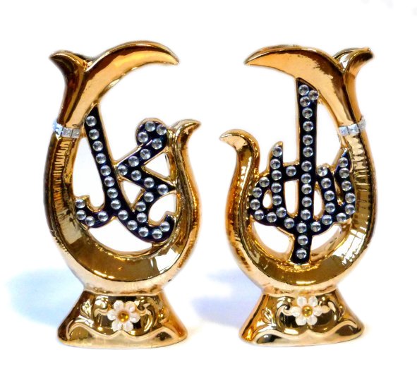 Ensemble de deux pièces décoratives en porcelaine dorées décorées de diamants avec inscriptions Allah dans la première et Mohammed dans la seconde.