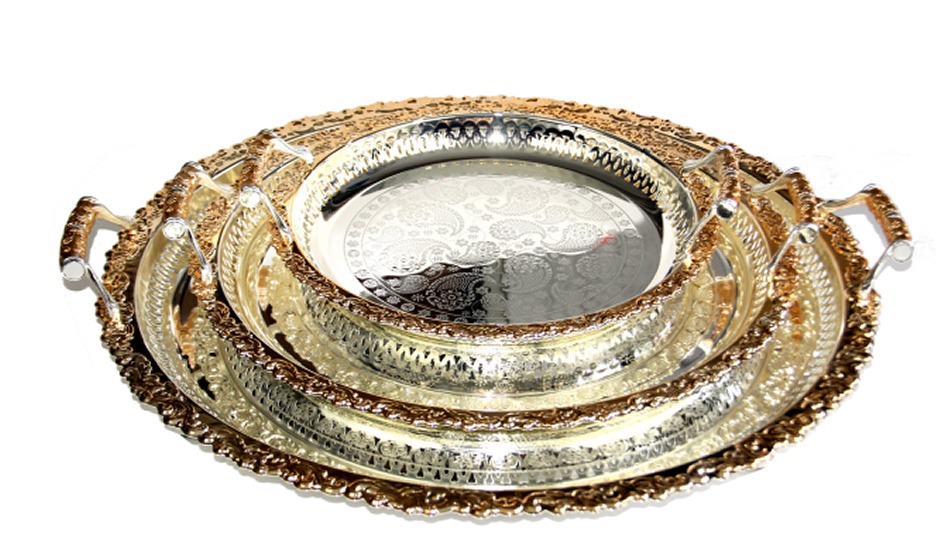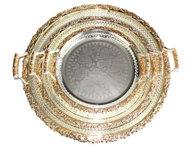 Trois magnifiques plateaux assortis en inox argentés avec parties dorées. Les poignées peuvent être placées ou non à votre guise.