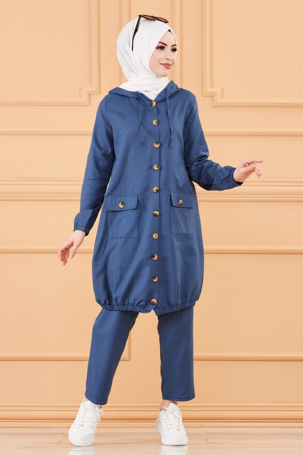Veste ample évasée à capuche et son pantalon assorti.