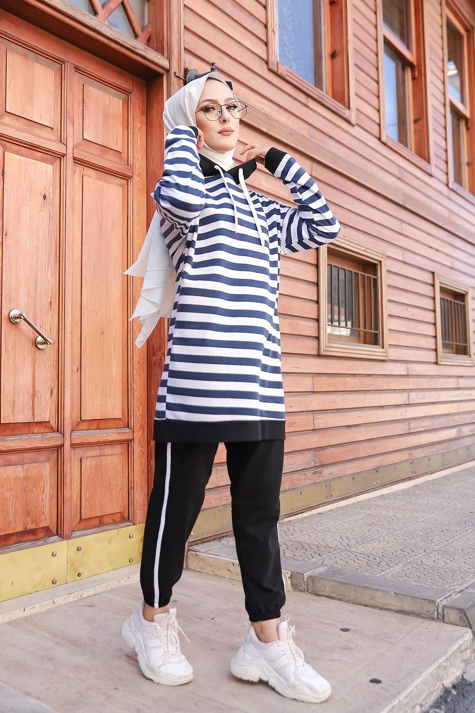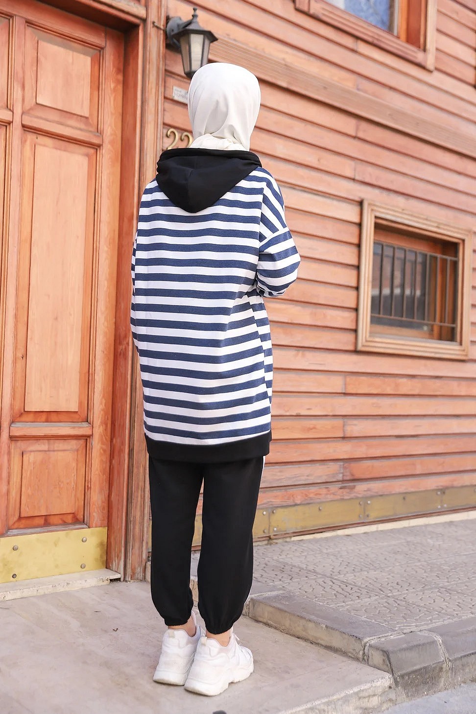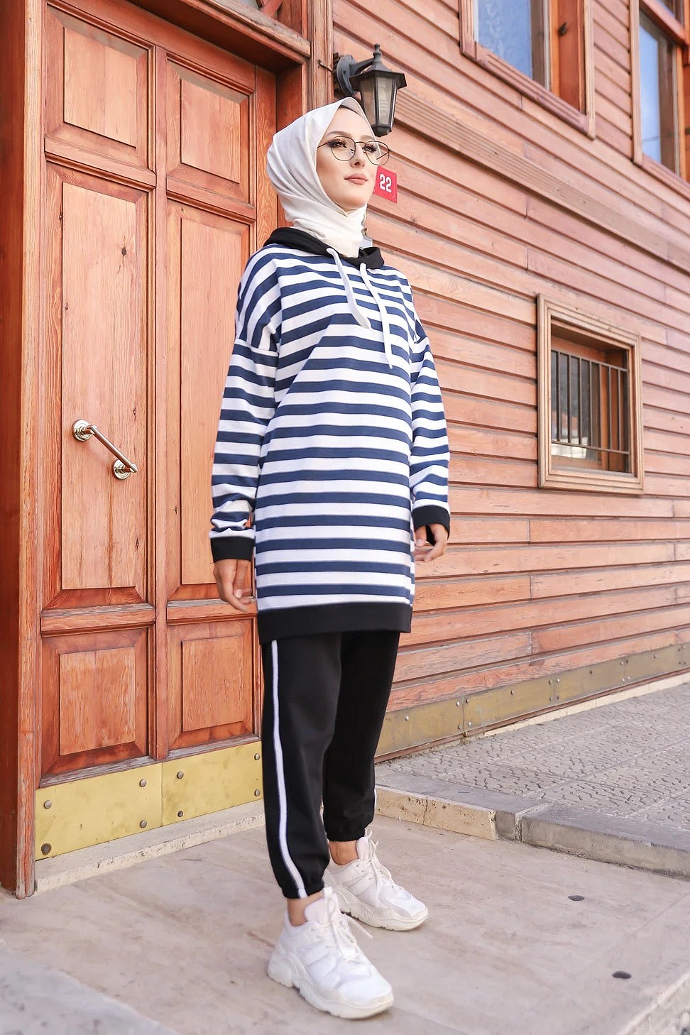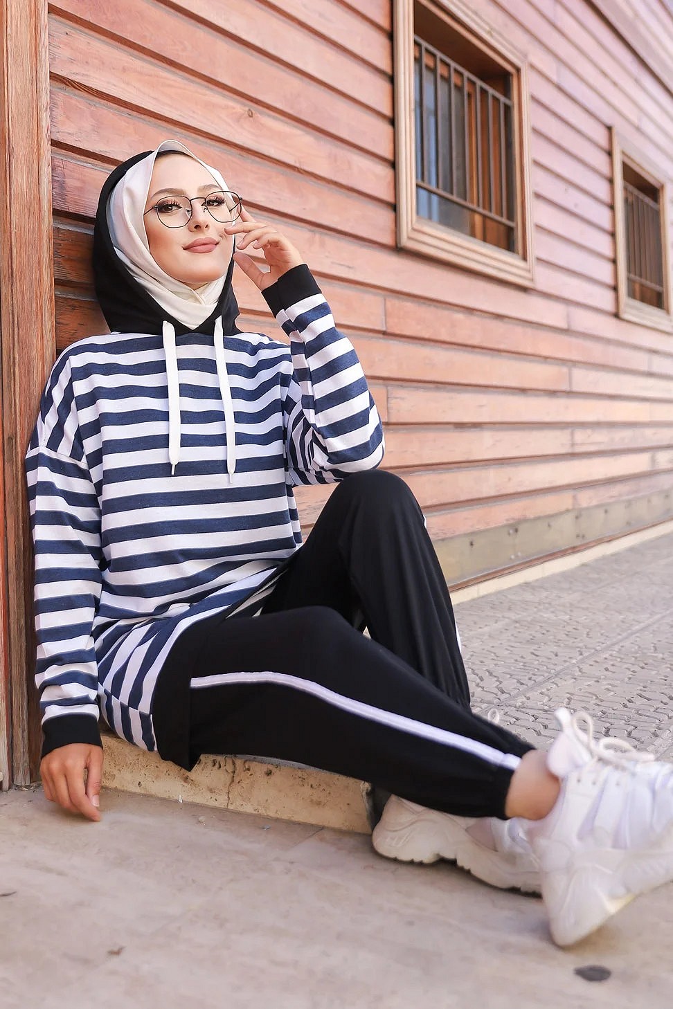 Ensemble décontracté de type sportswear - Survêtement 2 pièces à rayures pour femme voilée - Couleur Blanc et bleu Vetement & Accessoire