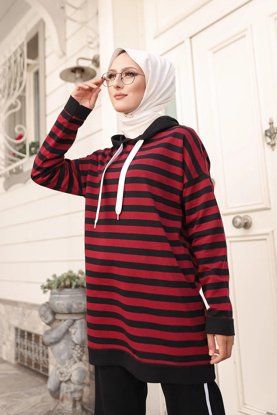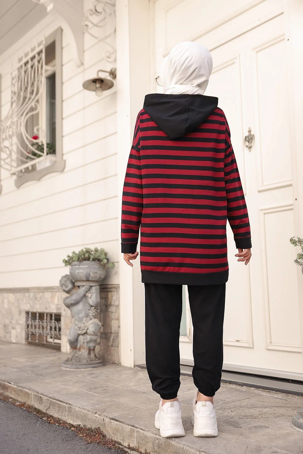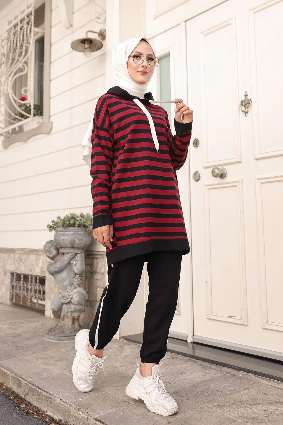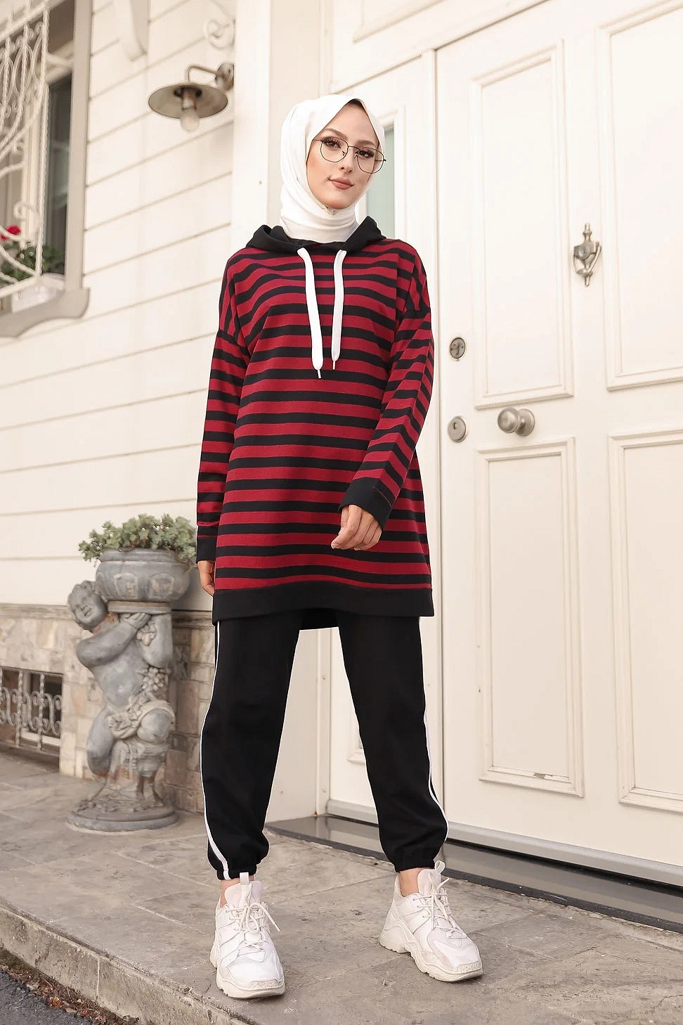 Ensemble décontracté de type sportswear pour femme musulmane - Survêtement 2 pièces à rayures - Couleur bordeaux et noir Vetement & Accessoire