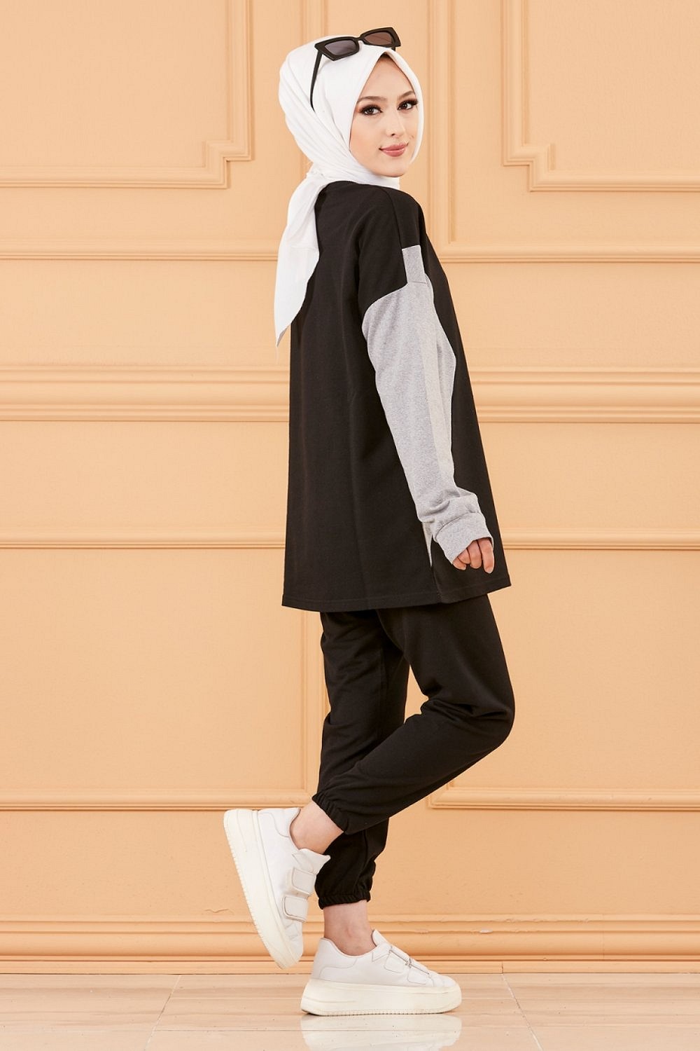 Tenue décontractée deux pièces (Pantalon jogging et Tunique) pour femme voilée - Ensemble sportswear à 3 couleurs : noir, beige et blanc - REF. 32918 (24.90 €)