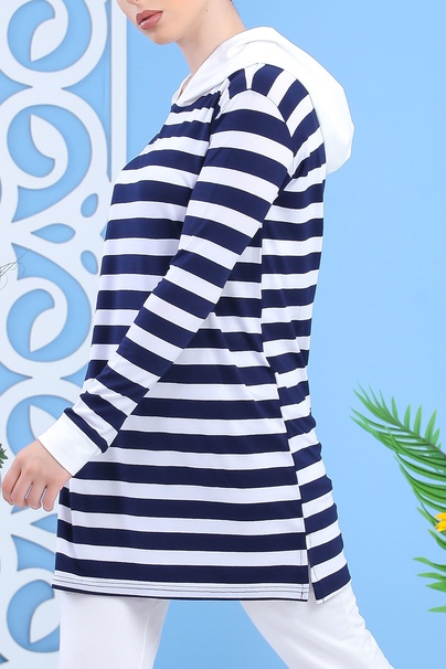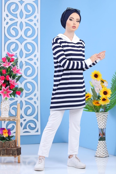 Tunique décontractée avec capuche (Vetement hijab) - Couleur noir avec bandes blanches - REF. 35622 (19.00 €) - En Promotion à 16.90 €