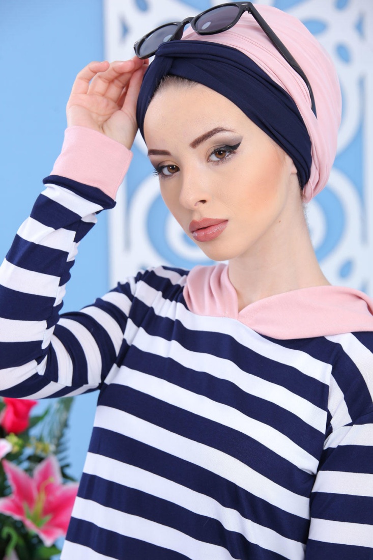 Veste sweat à capuche avec bandes pour jeune femme musulmane - Couleur bleu marine - REF. 32754 (25.00 €) - En Promotion à 19.90 €