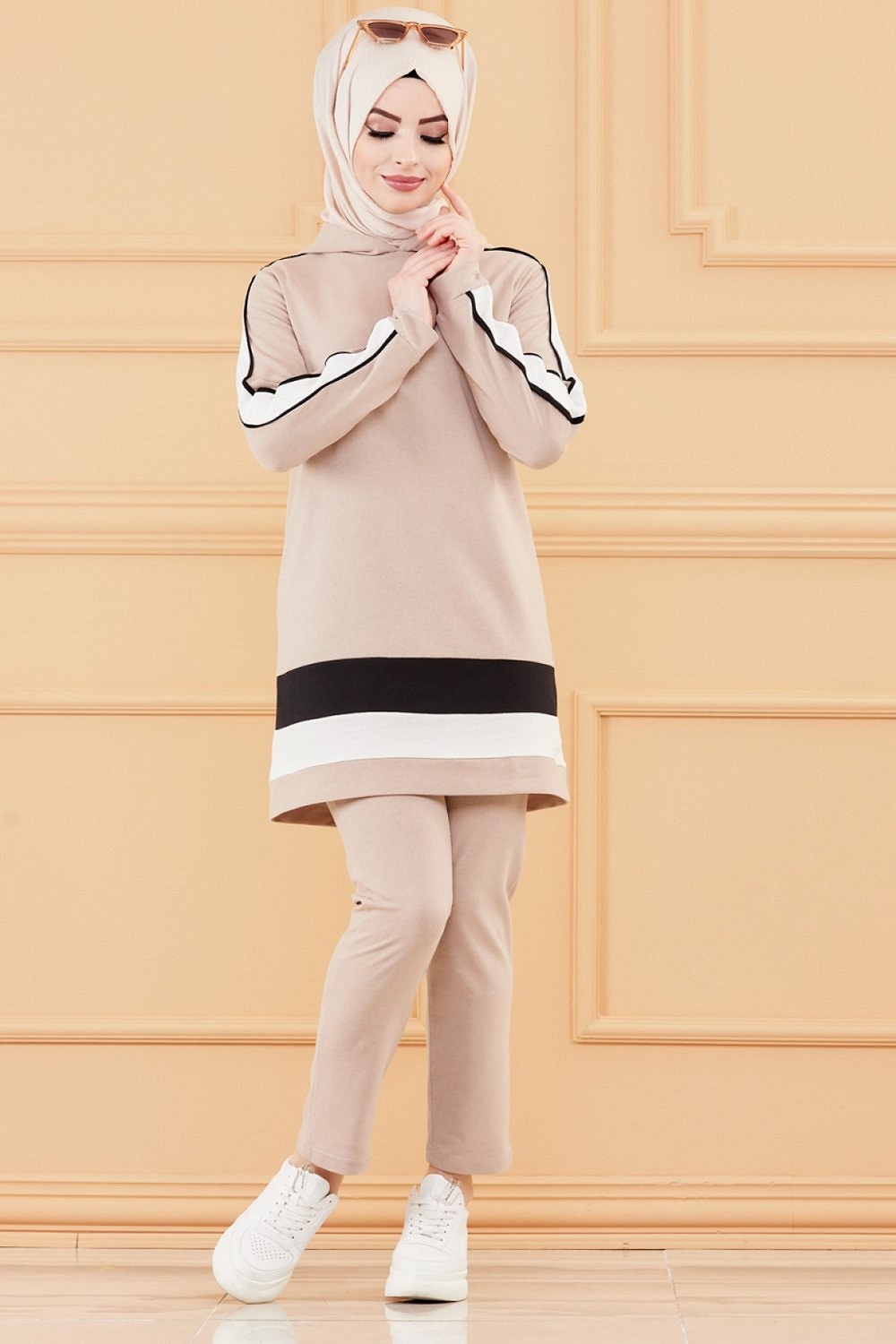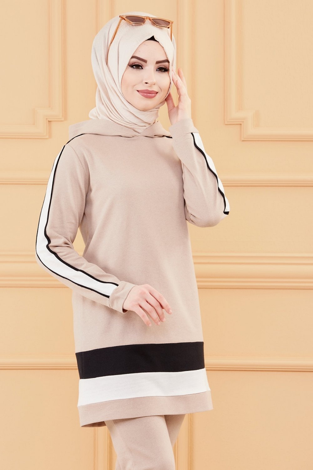 Ensemble bicolore pour femme : Sweat à capuche et pantalon assorti (Tenue décontractée et sport pour hijab) - Couleur beige - REF. 36360 (26.00 €)