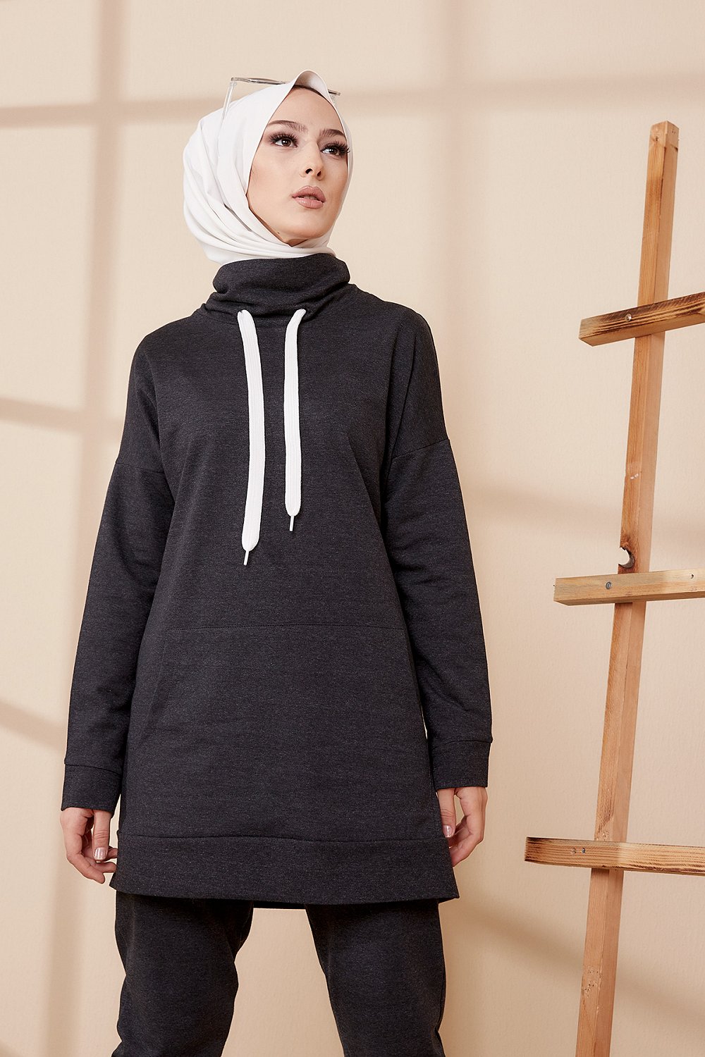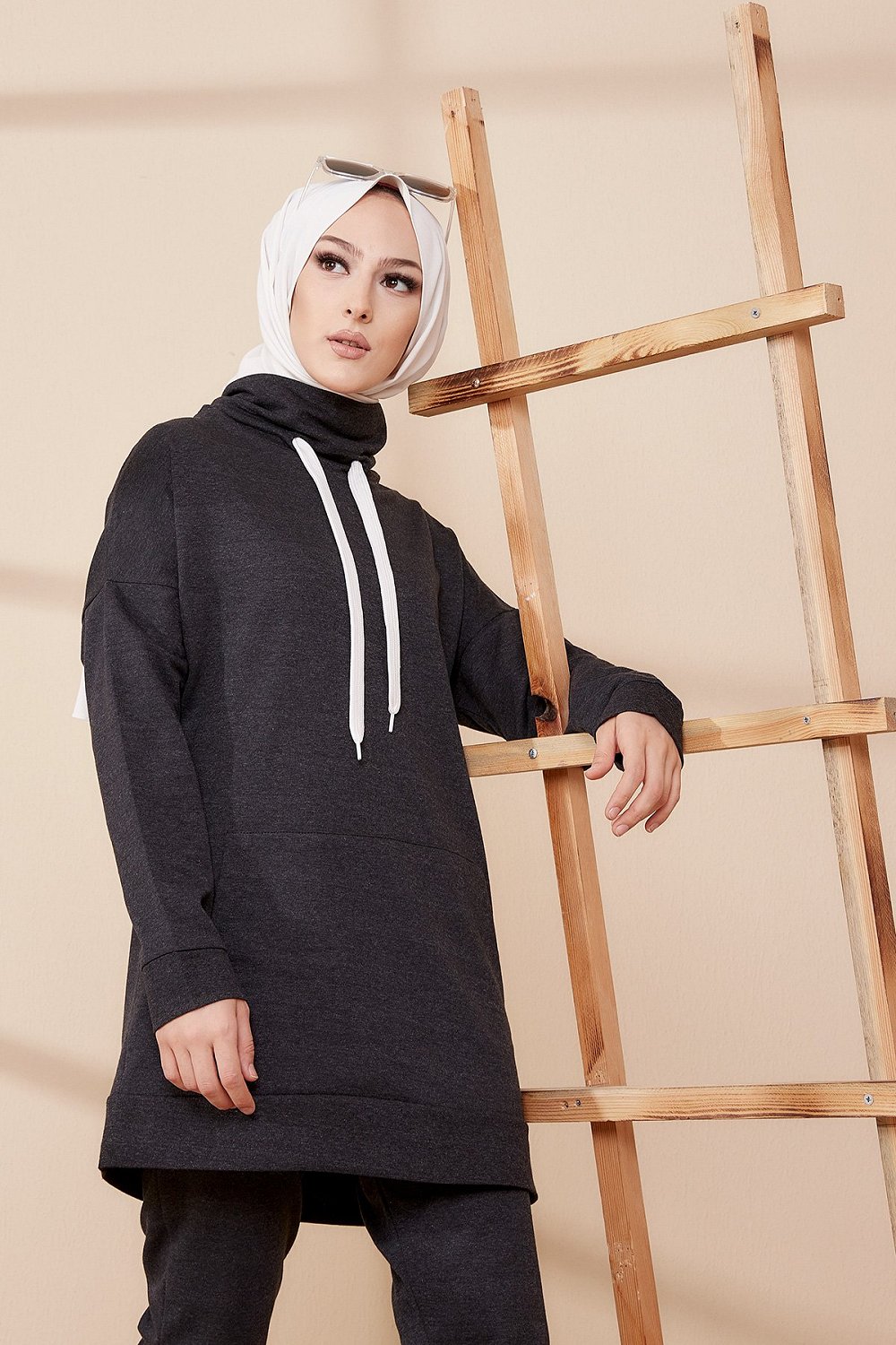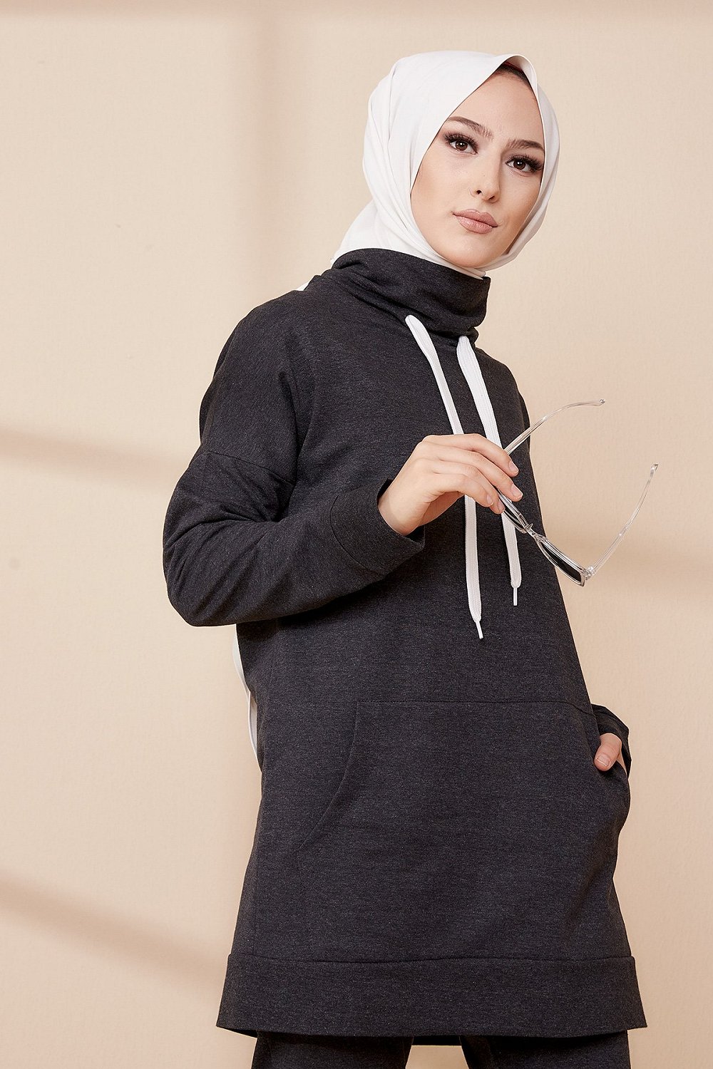 Sweatshirt long avec capuche style moderne décontracté et sport (Vêtement femme musulmane) - Couleur gris foncé - REF. 35365 (19.90 €)