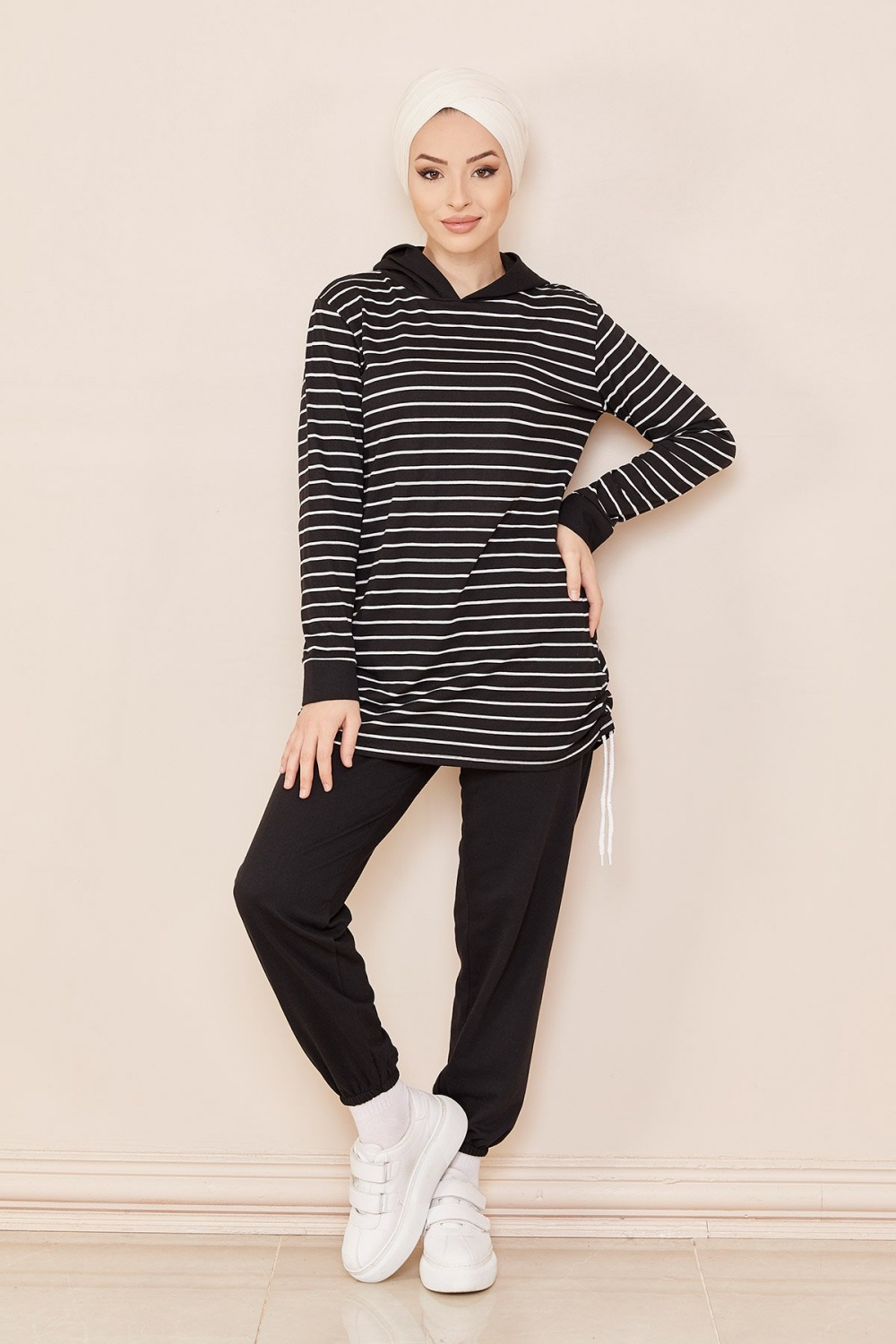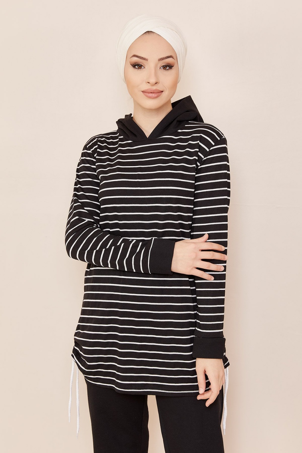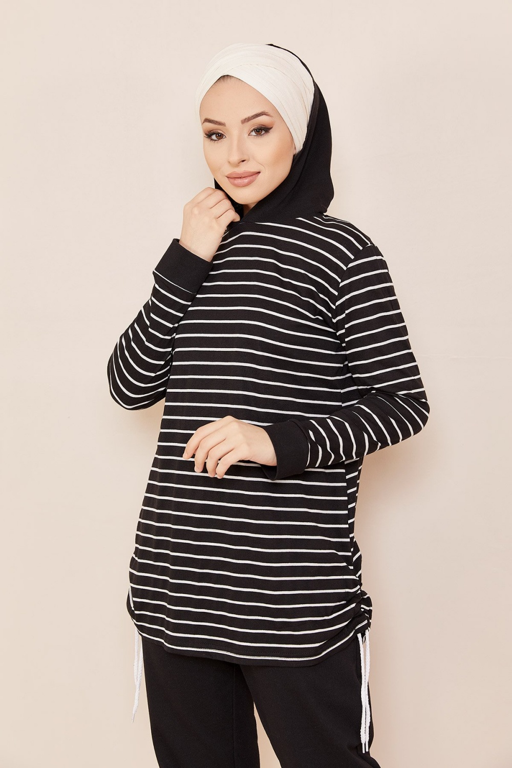 Tunique à capuche tricolore (Vêtement décontracté moderne pour femme voilée) - Couleur noir, blanc et vison - REF. 35564 (24.00 €)