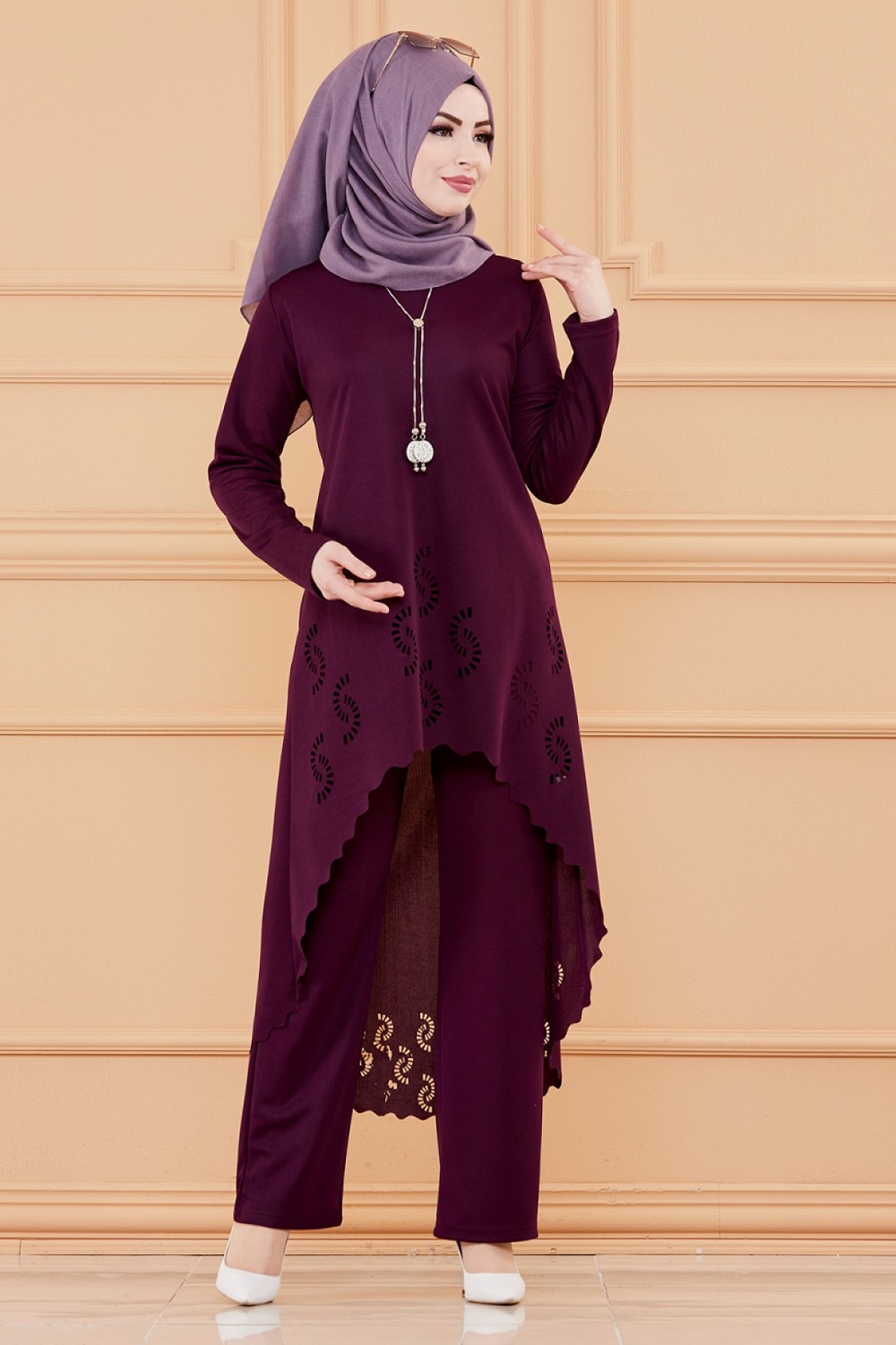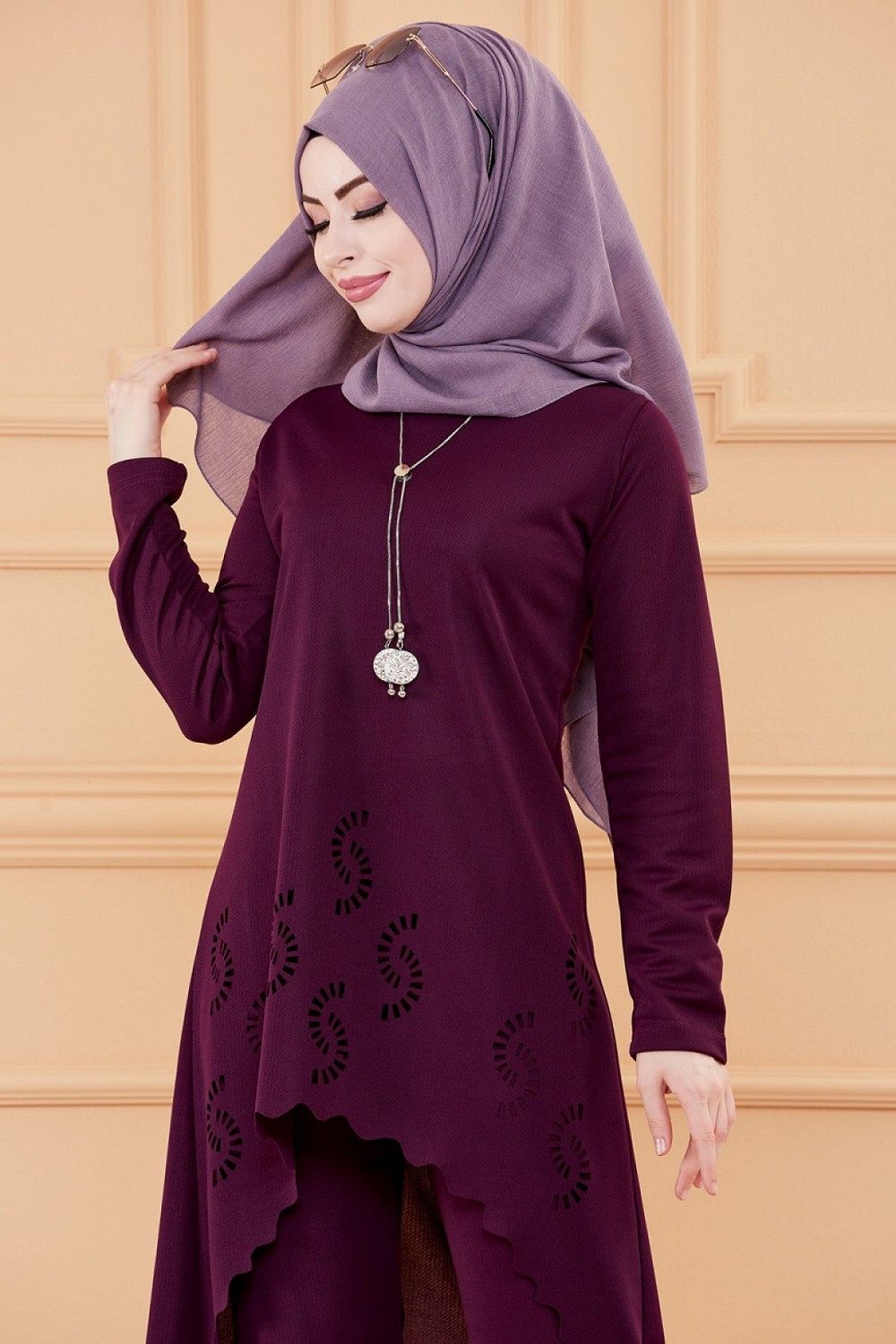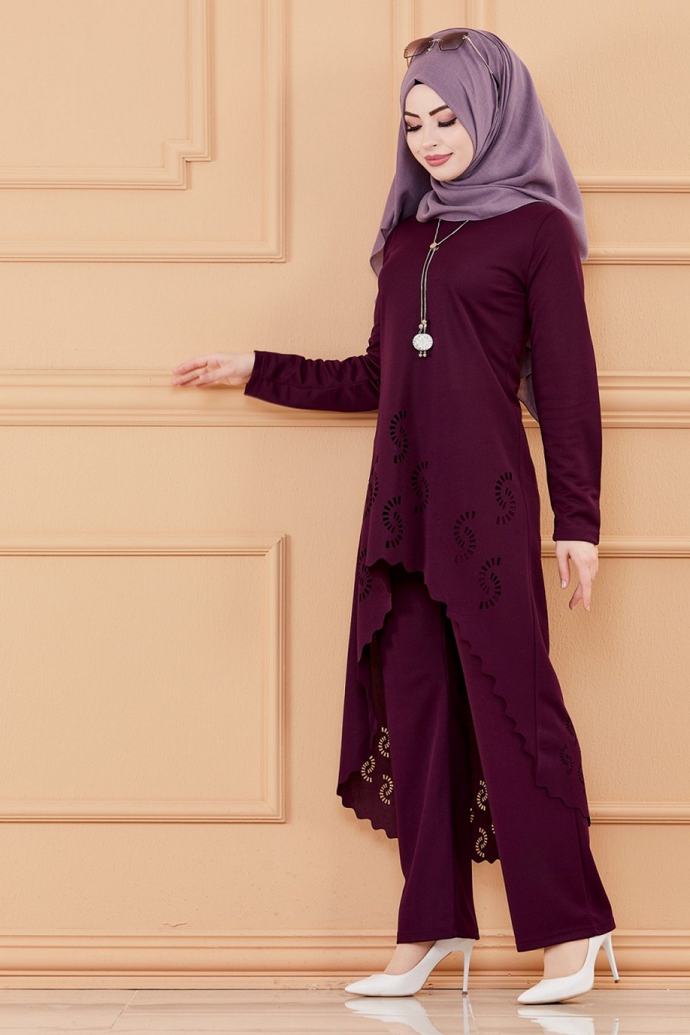 Ensemble decoupe au laser : Tunique et pantalon assorti pour femme (Vetement hijab classique) - Couleur prune