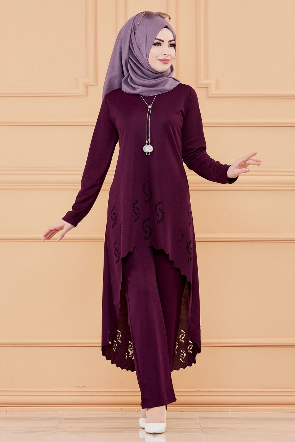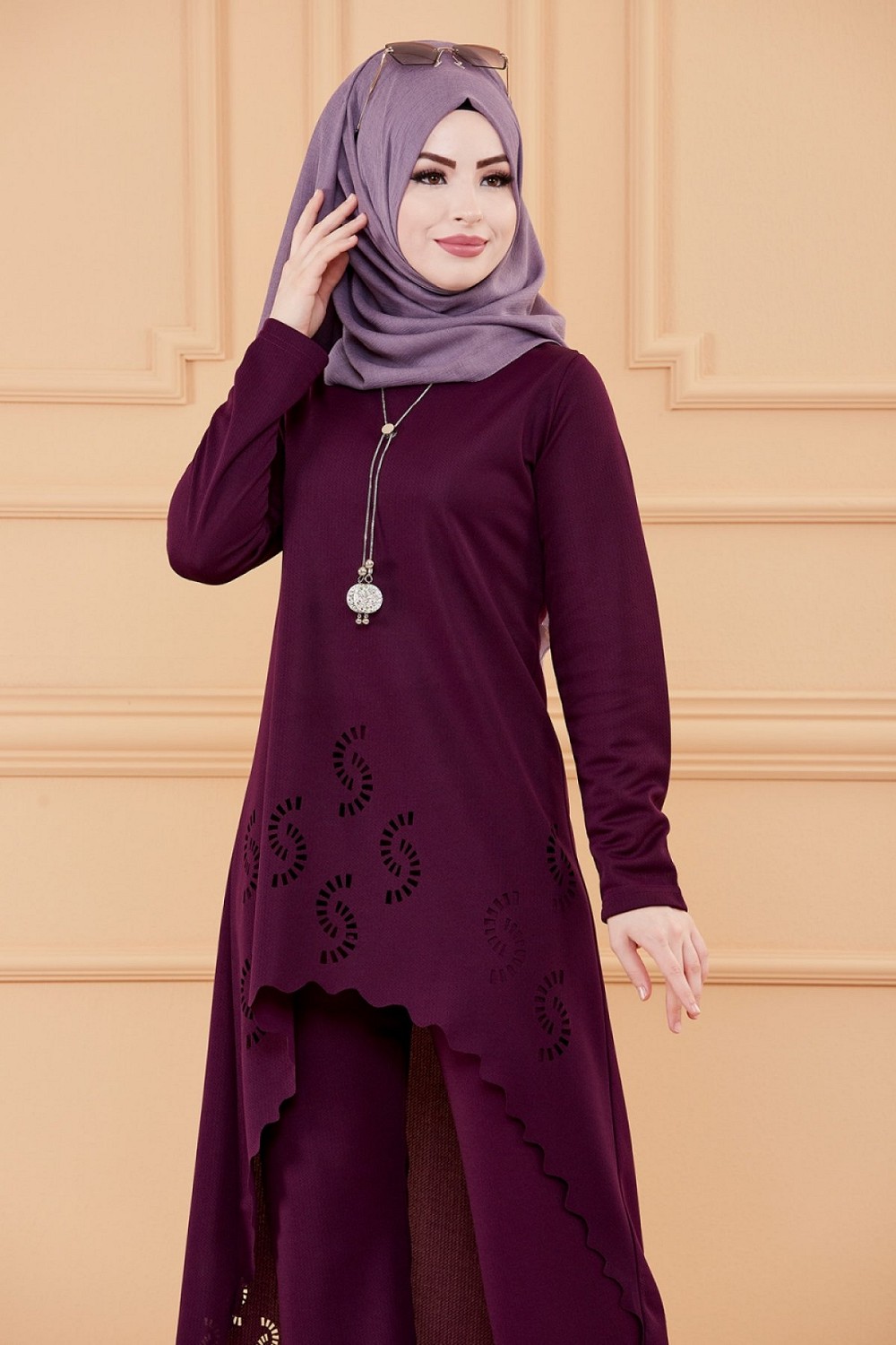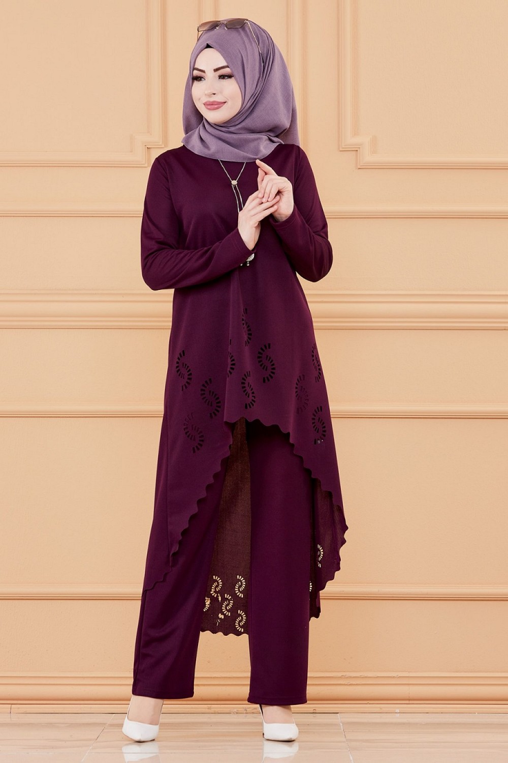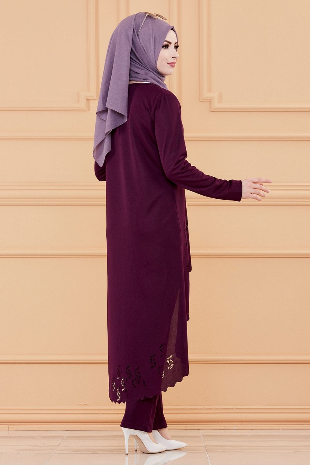 Ensemble decoupe au laser : Tunique et pantalon assorti pour femme (Vetement hijab classique) - Couleur prune