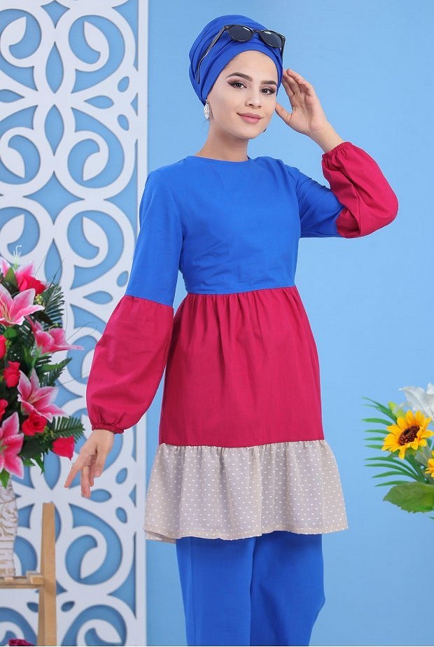 Ensemble 2 pièces : Tunique longue, col rond fermeture bouton, manches légèrement bouffantes, volants, coupe évasée ; et son pantalon assorti ample, coupe droite, taille élastique. Mélange de matières. Cet ensemble sobre et élégant n'a besoin de rien d'autre pour être mis en valeur.
