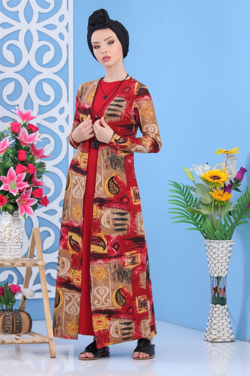 Ensemble femme : Robe bordeaux et kimono assorti (deux pieces) - Tenue chic et moderne pour un style decontracte