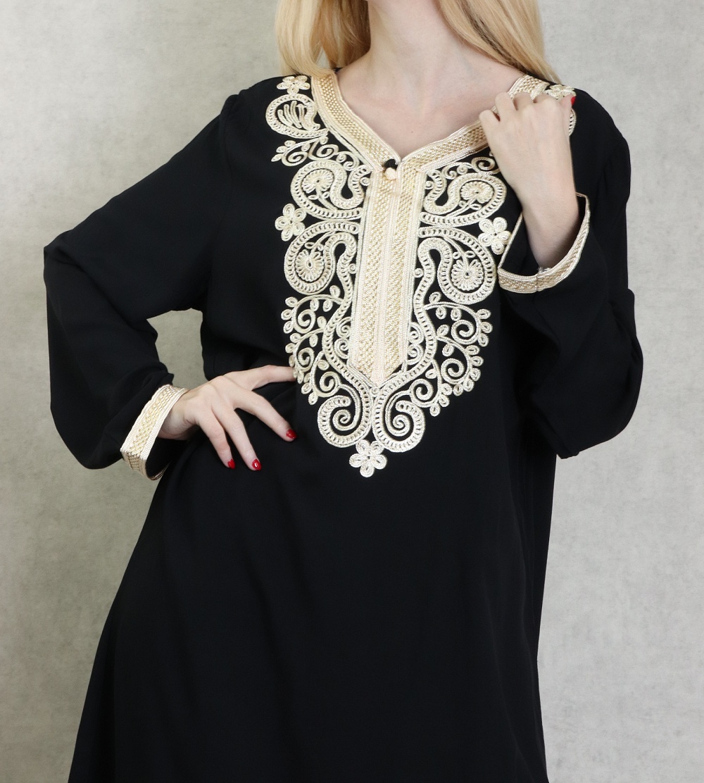 Robe Marocaine / Gandoura à manches longues avec broderie blanche - Couleur Noir