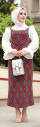 Robe Salopette femme à carreaux (Vente en ligne Prêt à porter femme musulmane) - Couleur gris et rouge - REF. 32831 (18.00 €) - En Promotion à 16.90 €