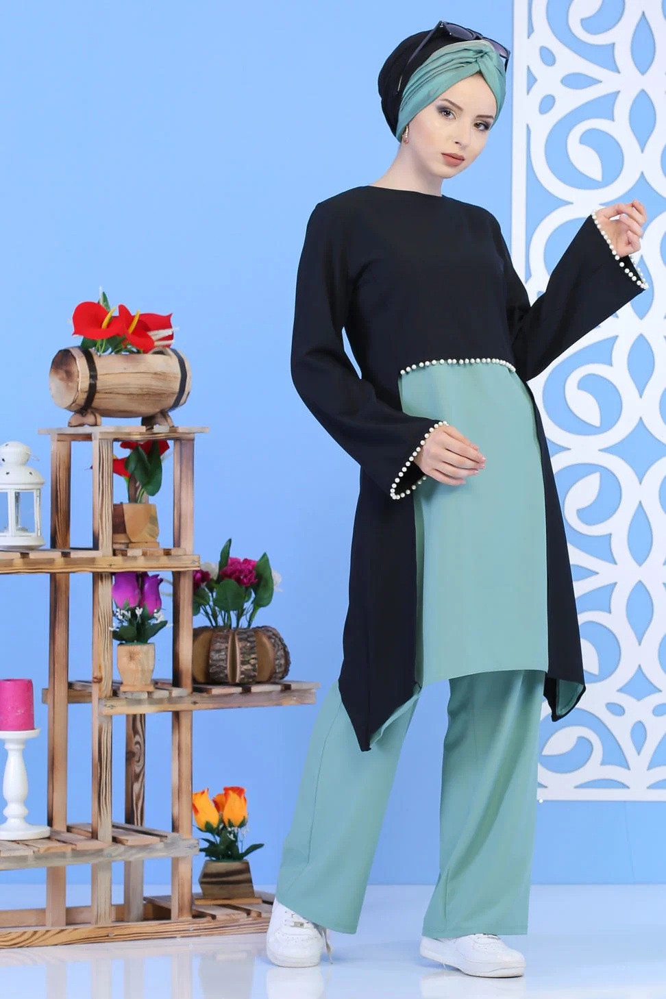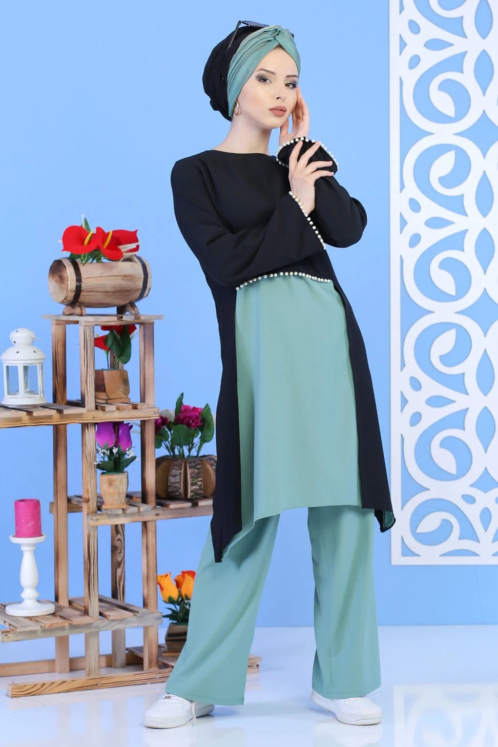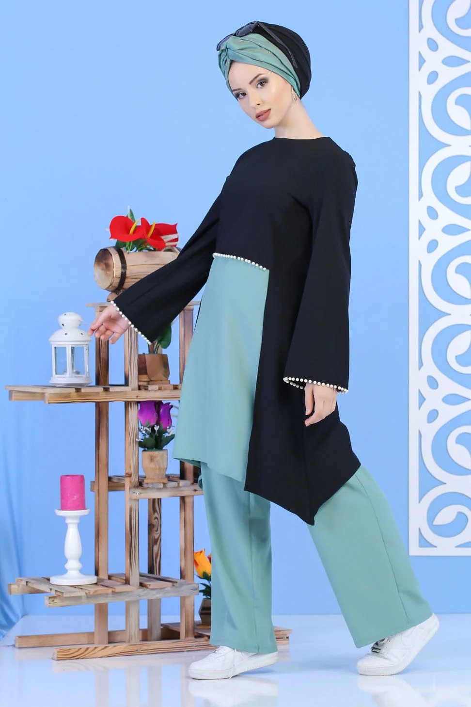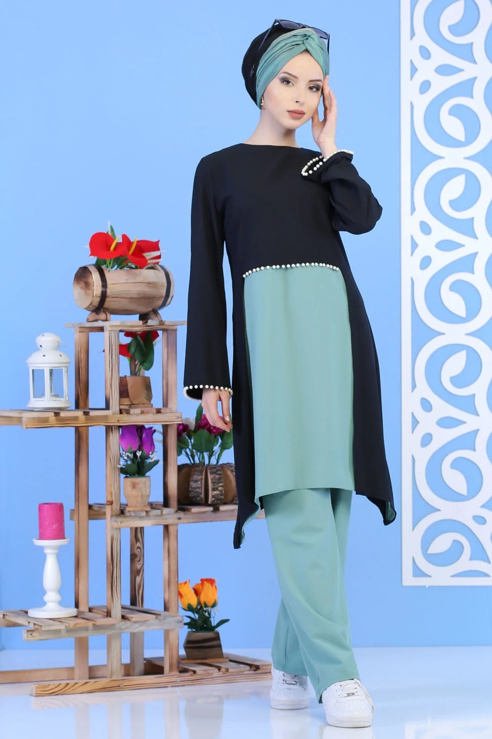 Ensemble perle tunique + pantalon de couleur noir et vert clair - Vetement femme a la fois mastour et chic