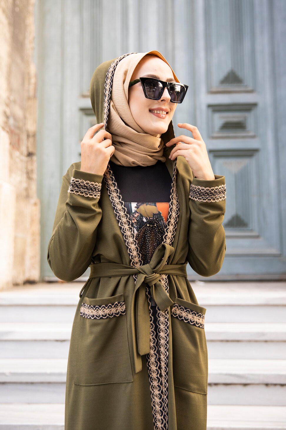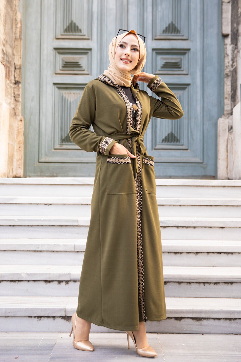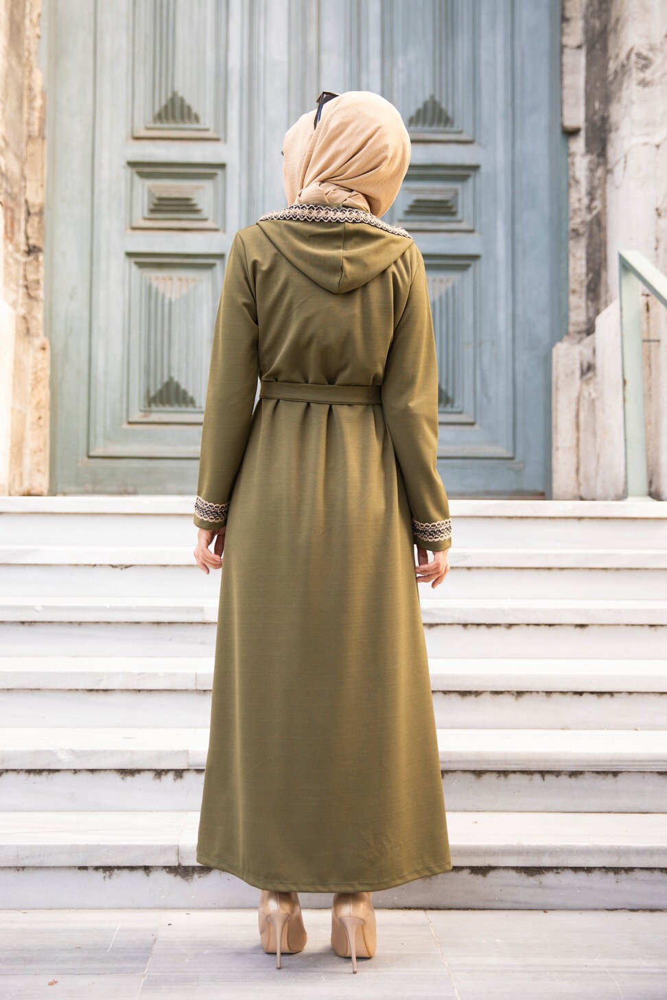 Robe-manteau boutonnée avec grandes poches et capuche (Vêtement mastour pour hijab) - Couleur kaki - REF. 36373 (29.90 €)