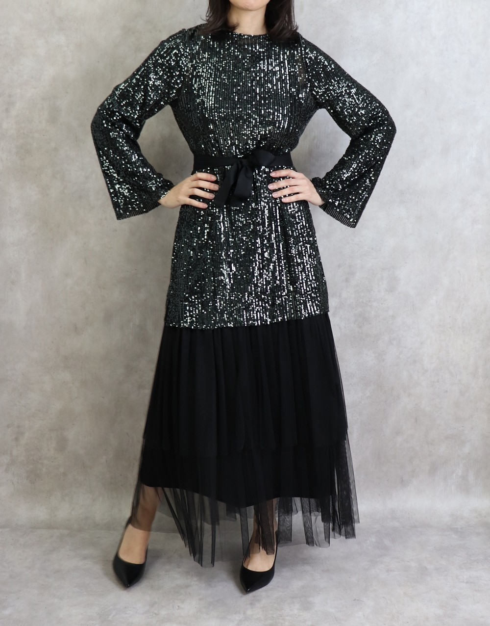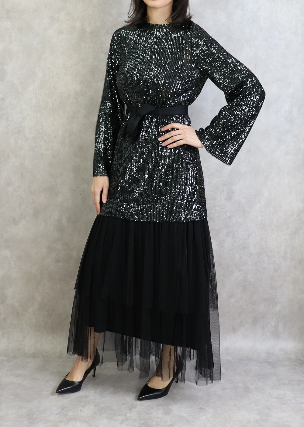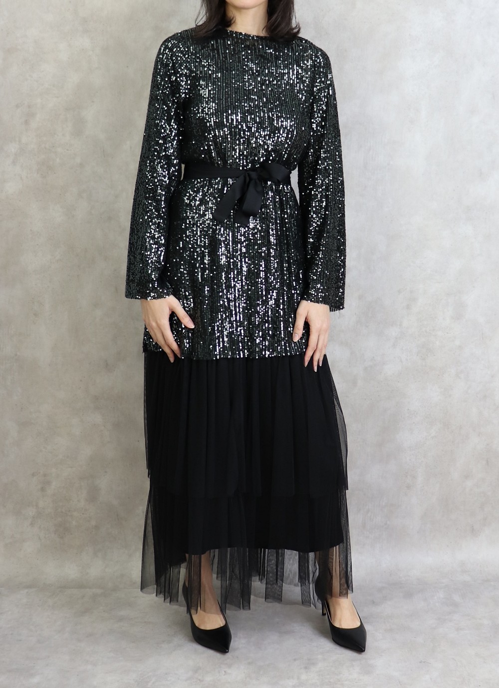 Tenue de soirée 2 pièces: Robe : longue, à bretelle, moitié du bas en tulle. Haut : mi long,col rond, coupe droite tout en strass. Fournit avec une ceinture noire pour dessiner la taille.